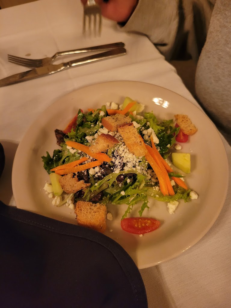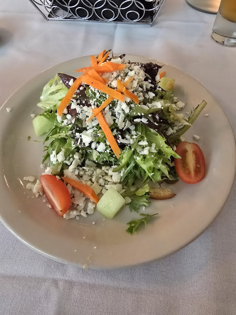 Side salad with house made dressing options. Salad was nice and crisp, delicate croutons and cheese crumbled, I chose goat cheese.