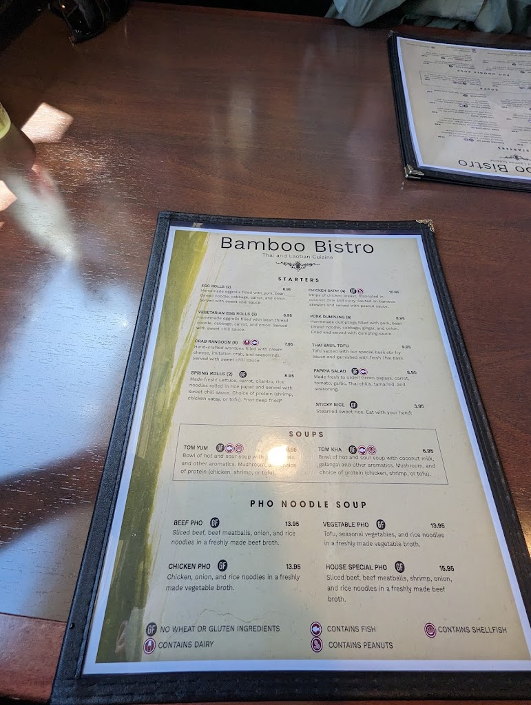 I used to like Bamboo Bistro, but it got bought out by new owners and their menu changed (we found this out after we got our food last time). I think they’re trying to go for a more Thai feel but it’s just not as good as it was before. The food is bogged down with fats and oils and it isn’t as light and airy as it used to be. I’ve eaten a lot of different Pad Thai dishes but something was just wrong about this. I didn’t finish my food and had stomach problems the whole night along with the other people I was dining with. Definitely won’t be going back, but the service was good and I enjoyed my honeydew boba tea. Probably best to call it the “Bamboozled Bistro” now.