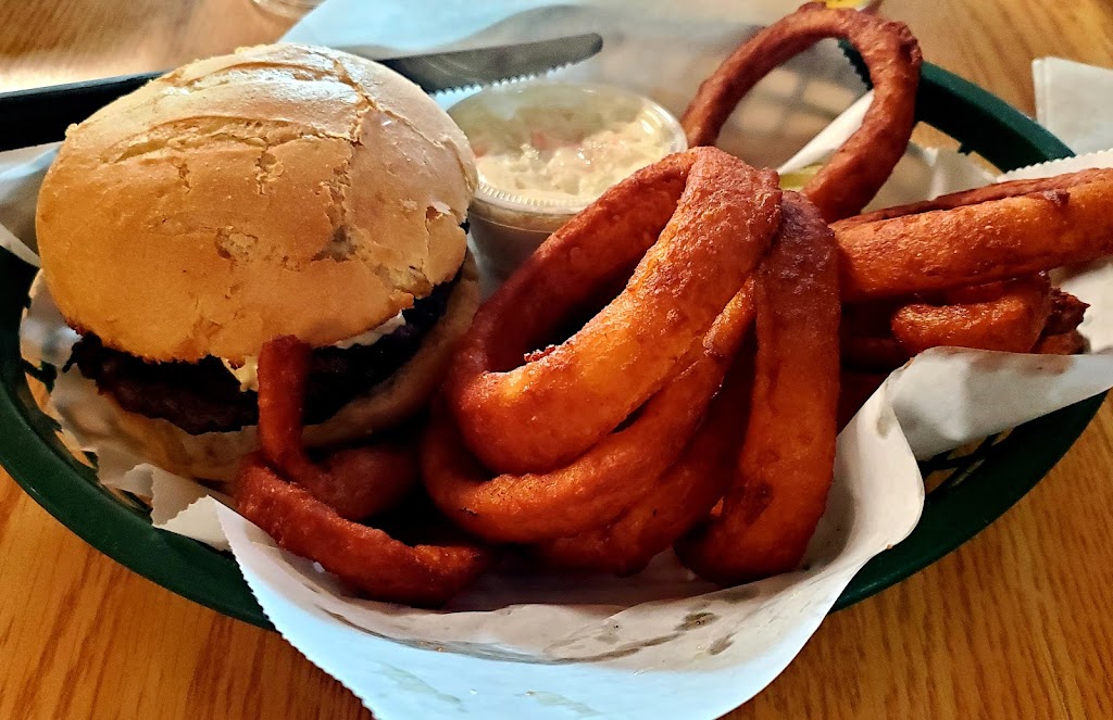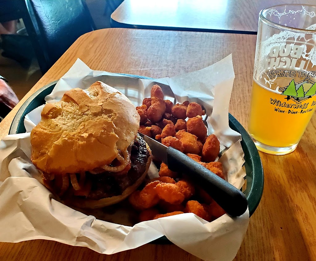 We stopped by for lunch today and had the most wonderful burgers! My husband had the Black and Blue Burger with cheese curds, and I had the Bear Burger (which had cream cheese and green olives) with onion rings. The burger buns tasted homemade, and were sooooo good! Fun atmosphere, tasty beers, great service! We will be back soon!