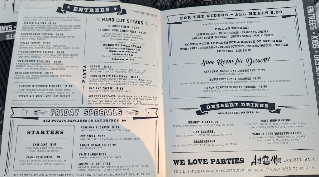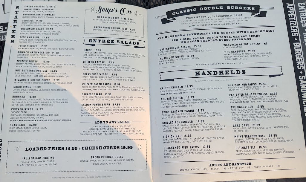 Food is bland and uninspired. The menu seems to be the same. I've had the pre rib sandwich, and it was nothing to brag about. But they do have the pulled ham, whixh was phenomenal. The fish fry and the pulled ham, and try the bacon Mac n cheese. For the prices the quality of food could be better. And the prime rib Sammy was very under seasoned. As a fine dining venue, the must strive to better. They have potential to be great, but seems to have a lazy head chef.