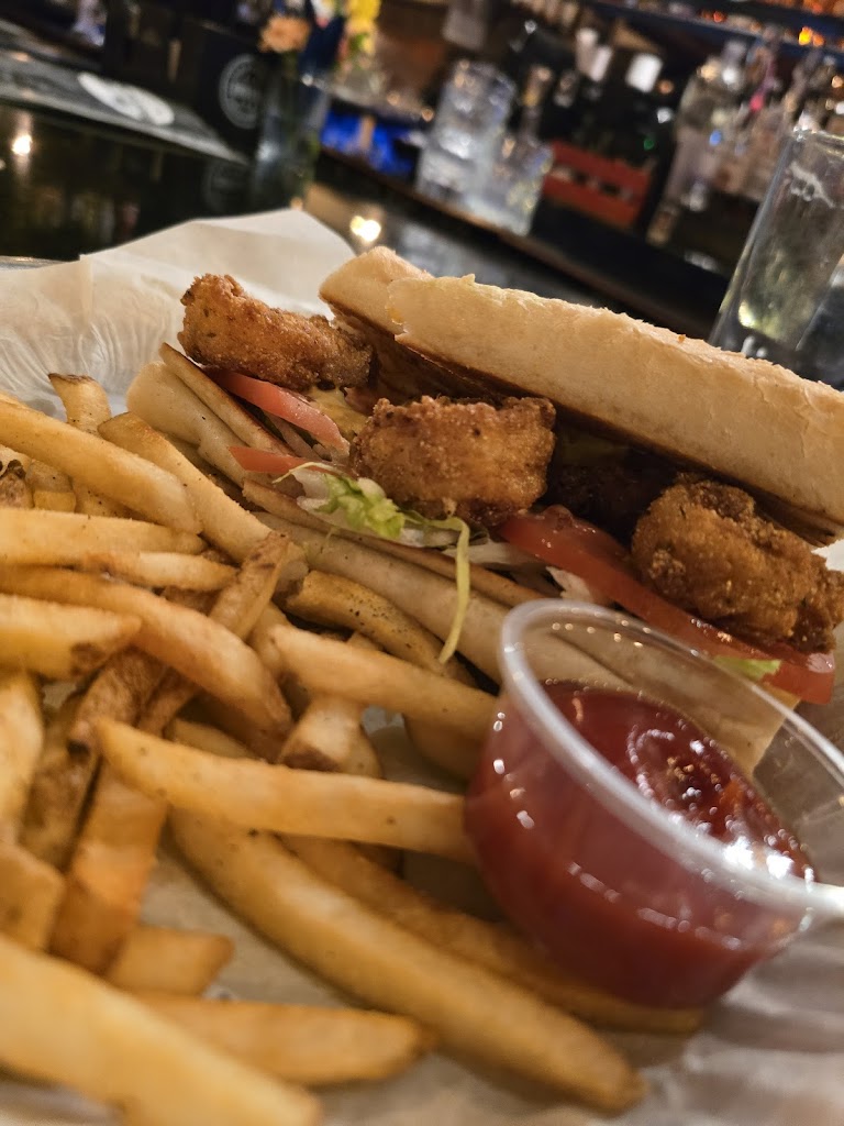 Great service and fun vibe at the bar!! Enjoyed the Flaming Pineapple (jalapeno) margarita, Spotted Bass, Audrey's Amber (great house beers) Deep Fried Cheese Curds, Spicy Chicken Panini and Shrimp Po Boy.