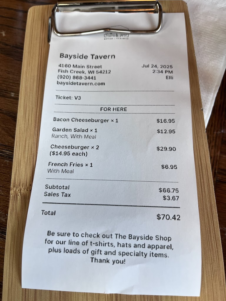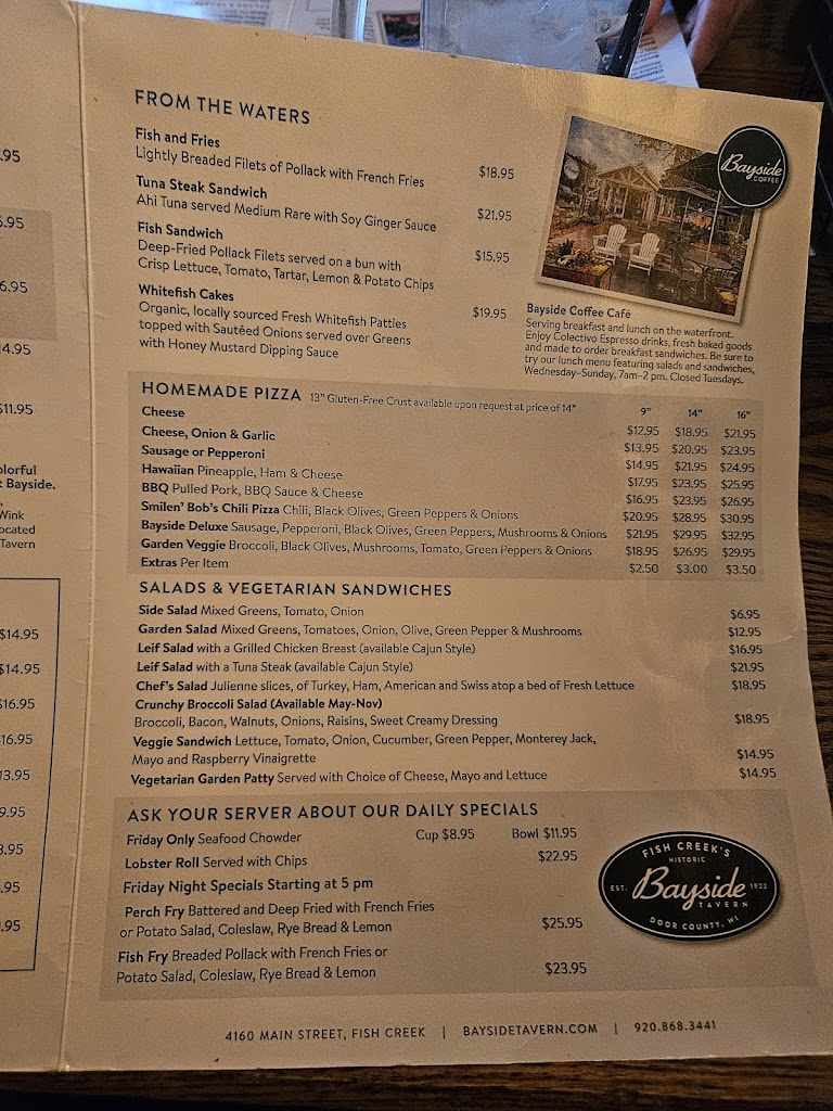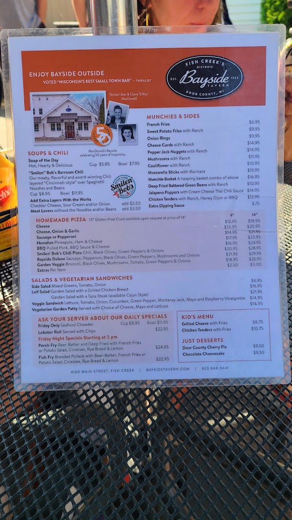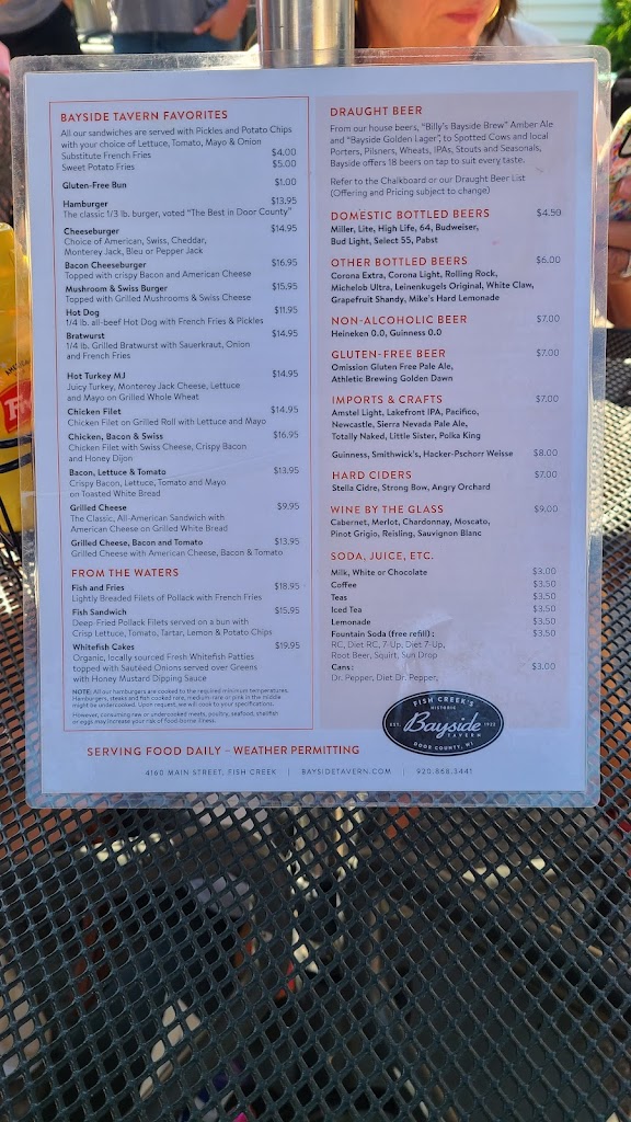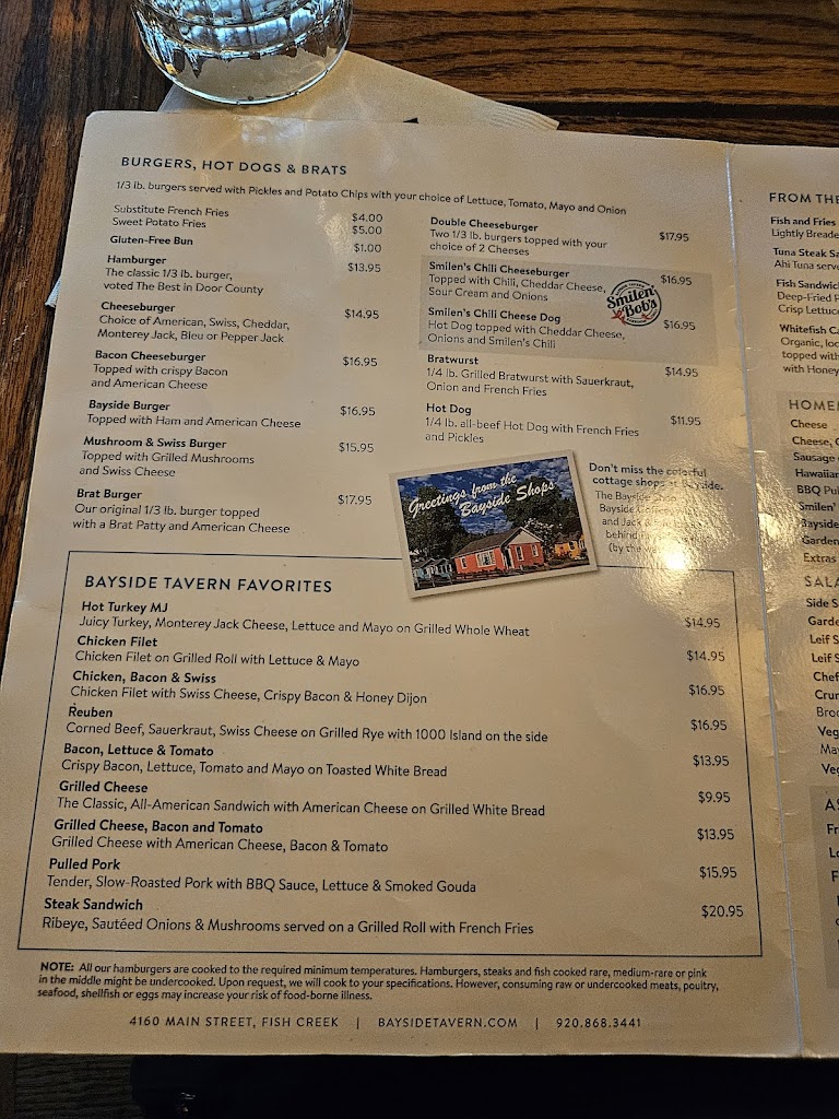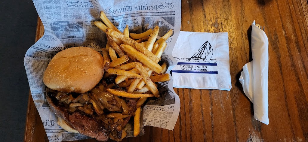 Bayside Tavern is excellent. The tavern is comfortable and inviting. The food and service were superb. My wife had a bacon cheese sandwich that was well prepared and delicious. I had the Swiss mushroom burger, and it was one of the tastiest burgers I have ever had. The portion size was huge. Mehmet, the cook, prepared the food to perfection, and Yusuf, our server, continually checked in with us and is very polite and attentive. When you travel through Fish Creek, please stop in at the Bayside. You will be pleasantly satisfied.