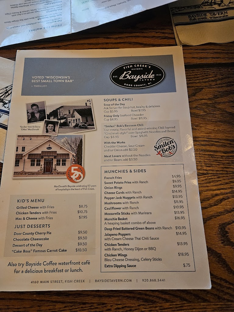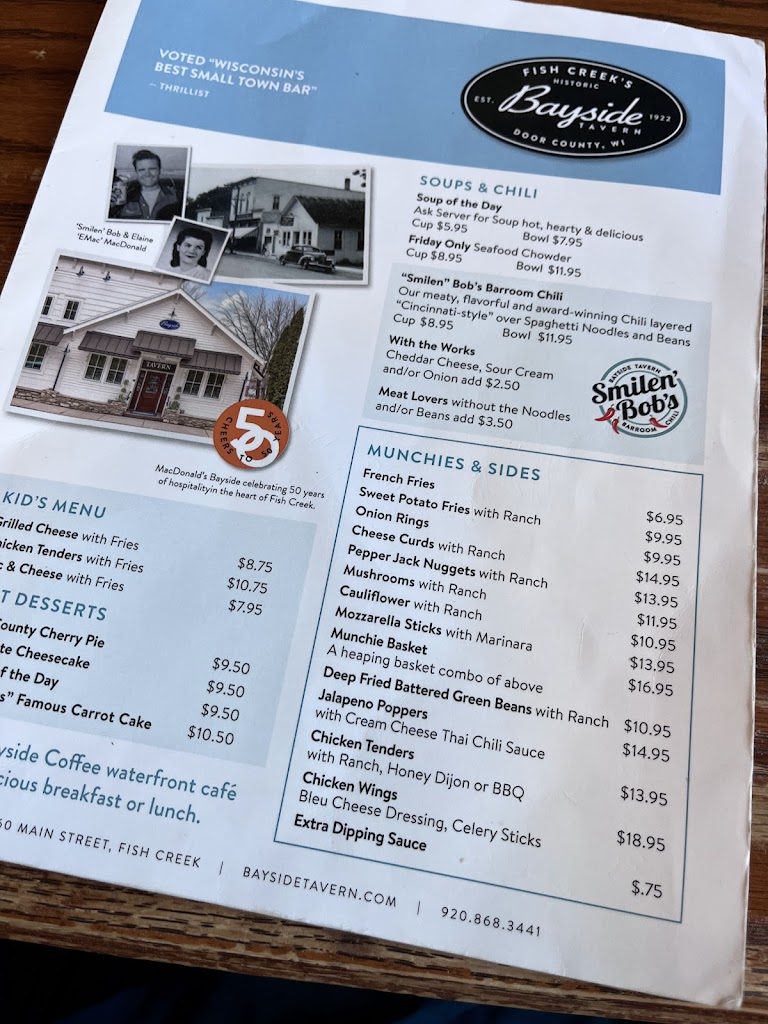Good bar food. Attentive service. Good prices. Has some outdoor seating too. Very crowded during peak evening hours. Strongly recommend when you are in Fish Creek Wisconsin.