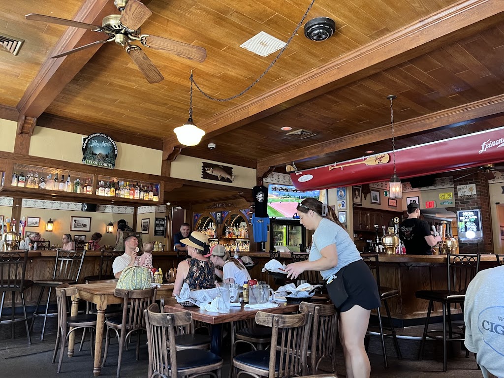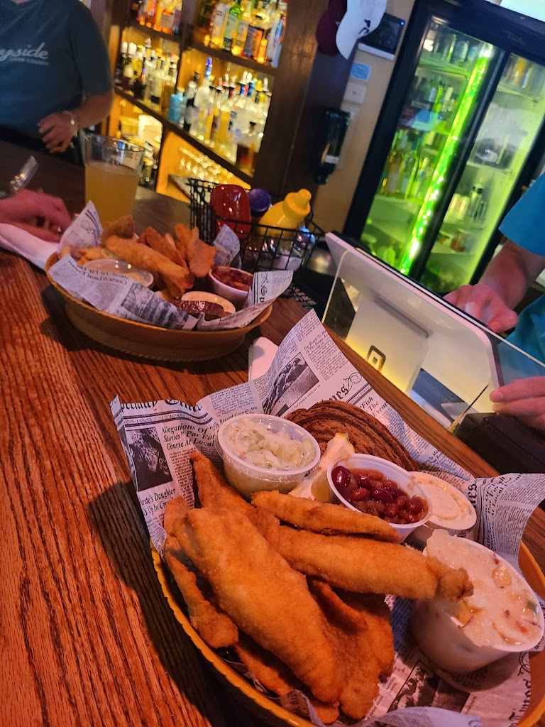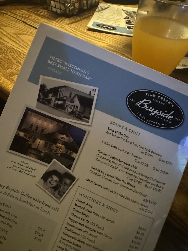 We went here because they were open later on a Sunday night in Door County and had a decent bar and grill menu. I would say, it’s basic. It’s your standard fair. The food is okay. We started with the fried mushrooms. You do get a heaping portion, and the ranch dressing it’s paired with is very good. The mushrooms were okay a little too much breading for my taste, but that’s me. My husband got the Ruben sandwich that he said was decent, not the best but not the worst. I got the fried fish and chips, huge portion, fries were piping hot which I like, the fish was good. Not the best I have ever had, but good. I wanted to try the chili, and maybe should have gone with that as I saw a man at the bar who seemed like a regular and was raving about the chili. Next time for sure!! I will say it’s a perfect place to watch the Packers game, and the service was great. The drinks I would say stick with beer. Can’t go wrong with beer. We both got a cherry bomb cocktail and it was honestly tasteless. We ate tourists trying to take in those cherry drinks, and these fell short, but a good draft beer would have been better. This a three star experience, when it comes to the food, but if you are going to just have a few beers and catch the game than it’s a five star, maybe try the chili.
