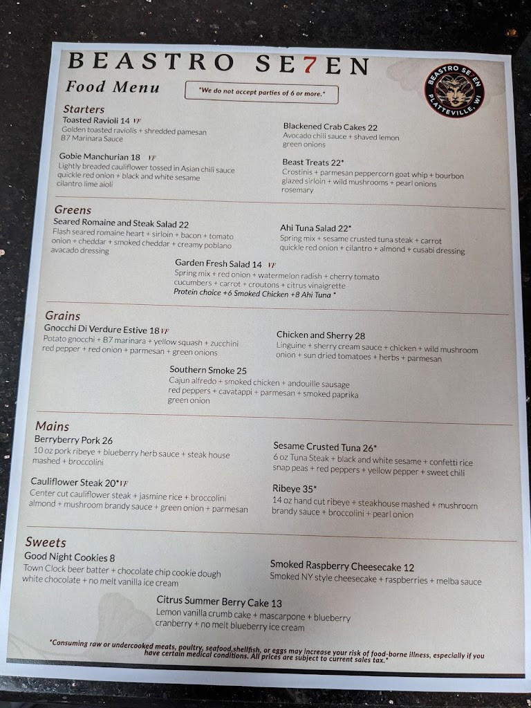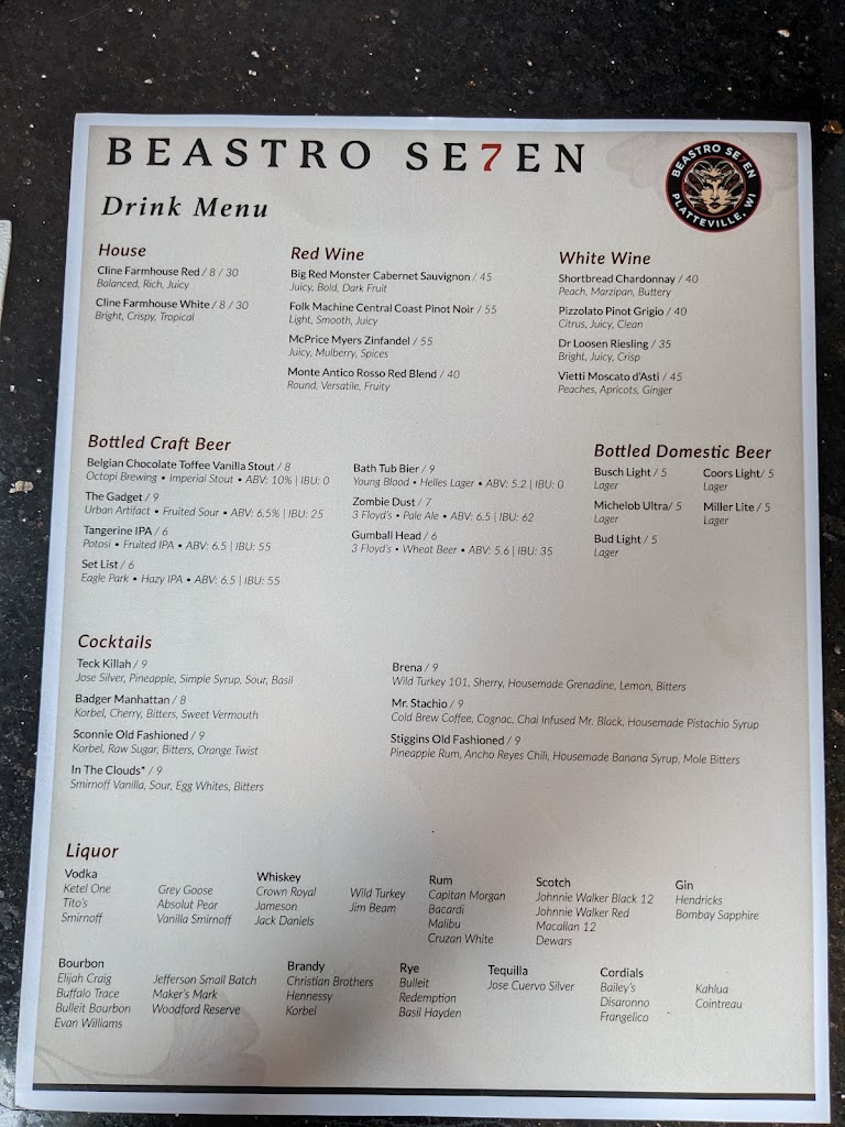Beastro Se7en is a wonderful dining addition to the Platteville area. The renovations to the building make this a quaint restaurant that provides a really fun atmosphere. The bartender was well versed in mixology and they have some of the custom cocktail options look like fun. The wait staff was amazing and very helpful.