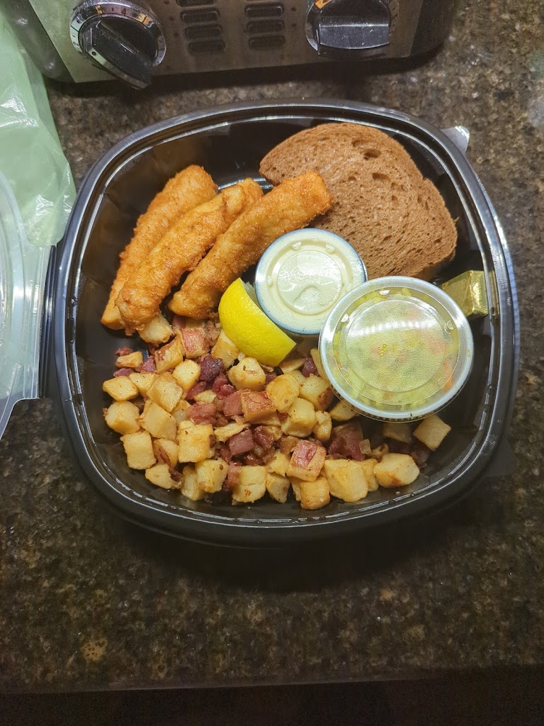 Service, atmosphere was wonderful. But this was my take home order. $18 for THIS?? Take home ACYE ? 3pce. of fish so skinny. Should have looked before I left. Disappointed. First time here.