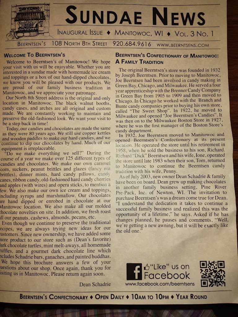 We've been coming to Beerntsen's in Manitowoc for decades and now we are lucky to live nearby so we can keep trying new treats. The employees are friendly and attentive and the place is nostalgic and historic, with gorgeous woodwork. We're looking forward to continuing to enjoy all that Beerntsen's has to offer.