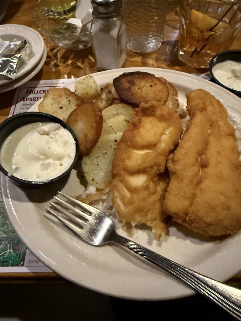 The fish fry was delicious, the grasshopper was delicious.. needed potato pancakes with a fish fry.. French fries were not good, should have had a baked potato.. bartender and waitress were great..as busy as they were they all did a wonderful job.