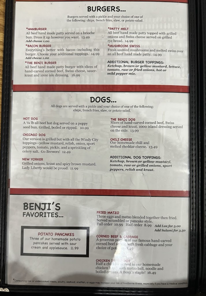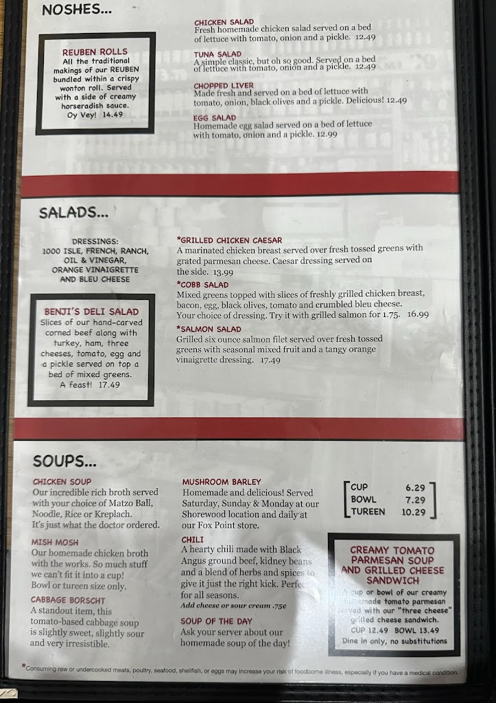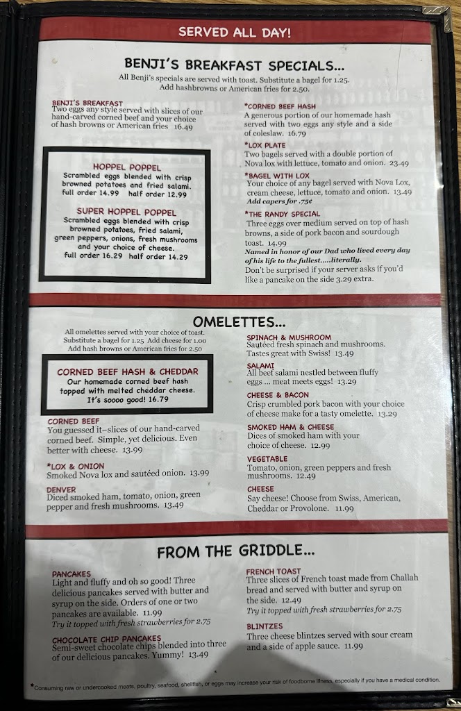 I’ve been eating here for many years during the Benji years and have been several times since Benji sold. Today I had my usual cold matzo ball soup and not usual old lox that shouldn’t have been served and weren’t presented in the usual appealing way. Both were taken off our tab. Generally we enjoy most of what we order, excellent corn beef, best tuna fish salad anywhere, great fries, and friendly staff.