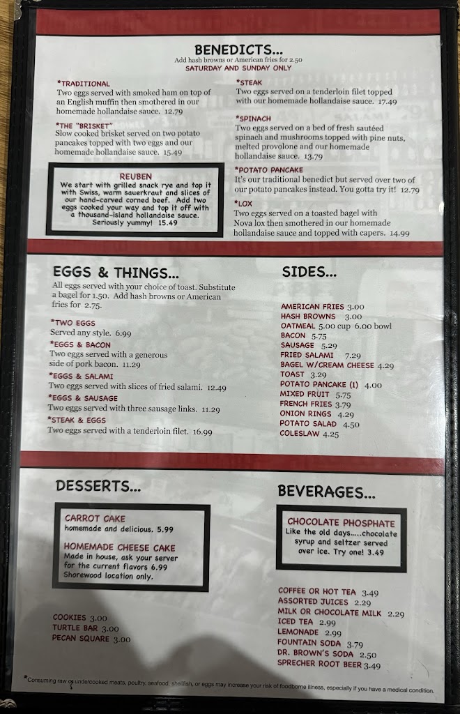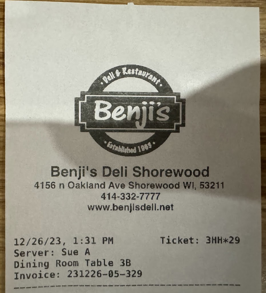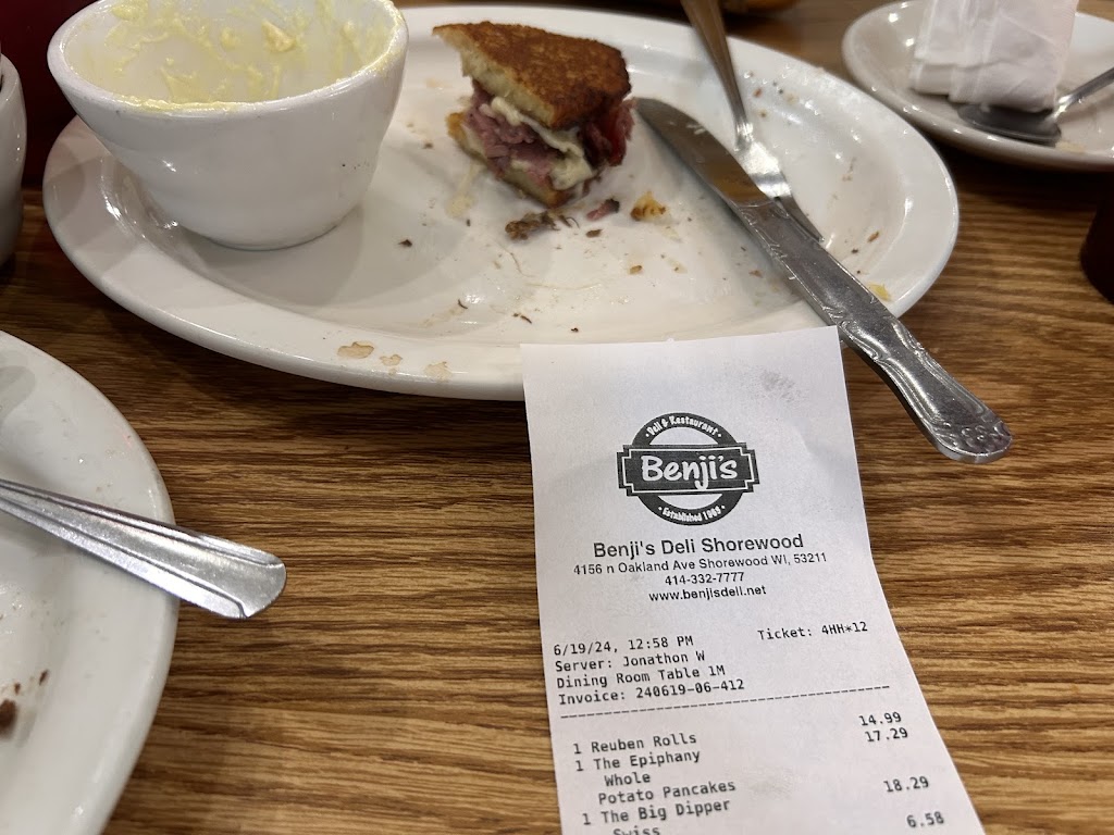 KUDOS TO SUE A., OUR SERVER💙🥳 My first Benji's was 1978 but it's been very infrequent cuz I'm 60 miles away, but my very elderly mom and I were driving thru Milw and it popped into our heads. SUE JUST WAS SOOO WARM AND ATTENTIVE and the food was every bit as good as it had always been. Giant matzo egg/onion pancake, mom's favorite strawberry blintzes. Leftover box🥰