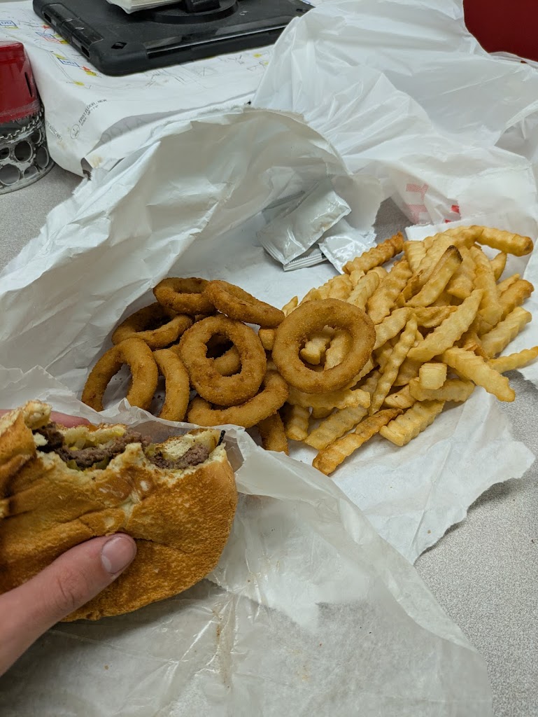 I recieved my food simi hot and very organized i order a hamburger meal mozz sticks and onion ring and pizza great food