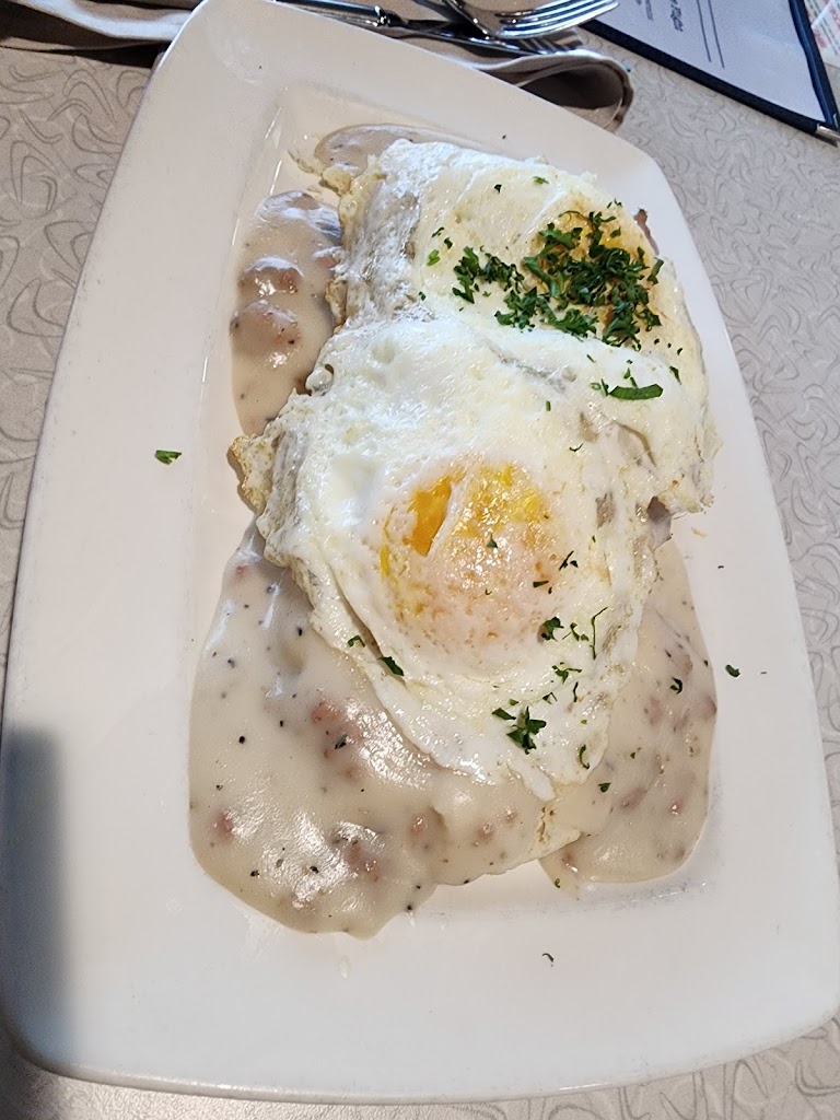 This dinner was perfect. The food was outstanding, the Biscuits and Gravy w/ the Two Eggs, and the Chocolate Waffles. The service was a little slow, but it was busy. The atmosphere was crowded but very freindly!