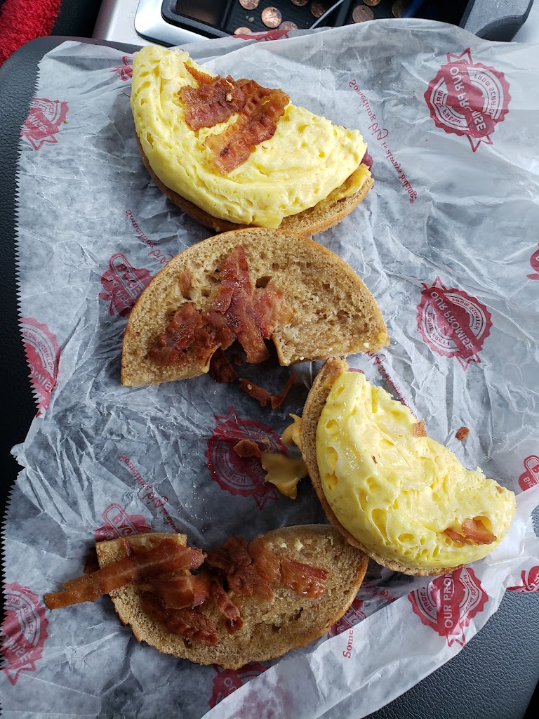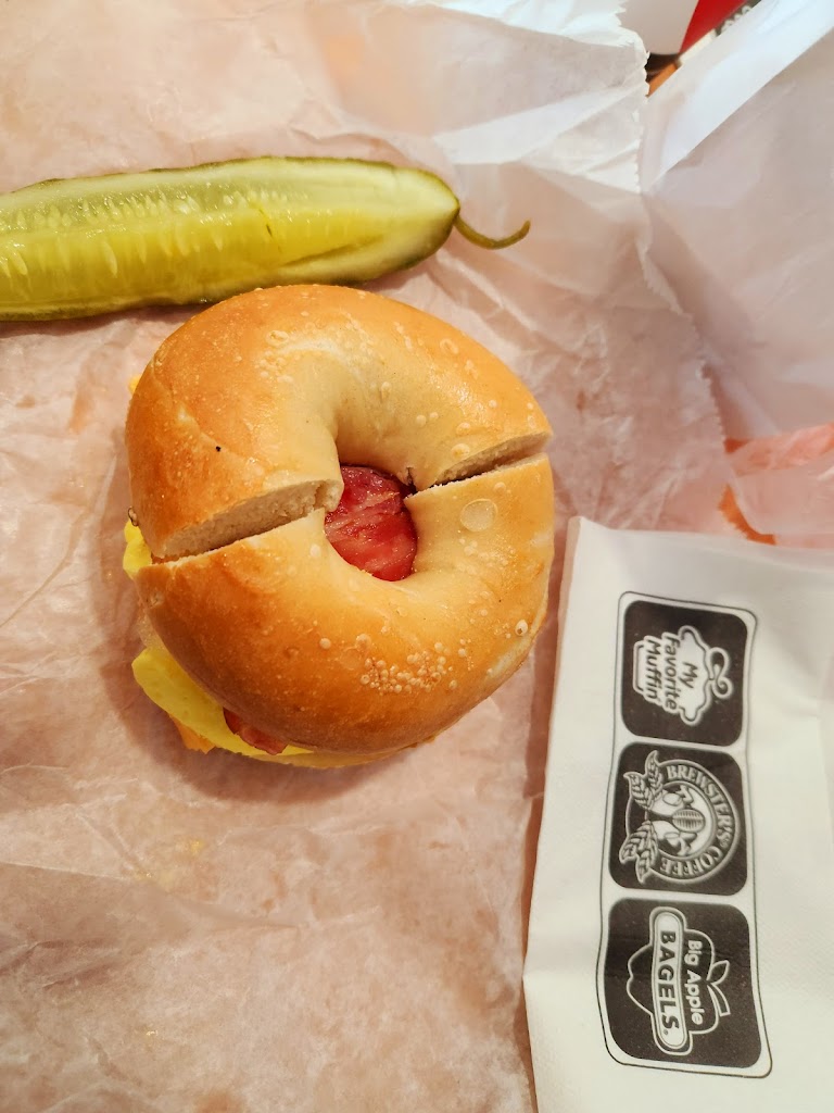 If you love McDonald's breakfast bagel sandwiches, which I do, these are even better. Big fluffy egg, bacon, cheese on plain bagel. Best in town! Never tried anything else.