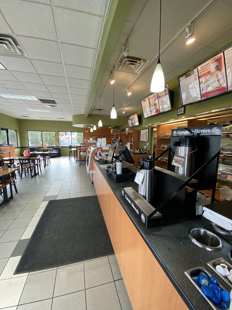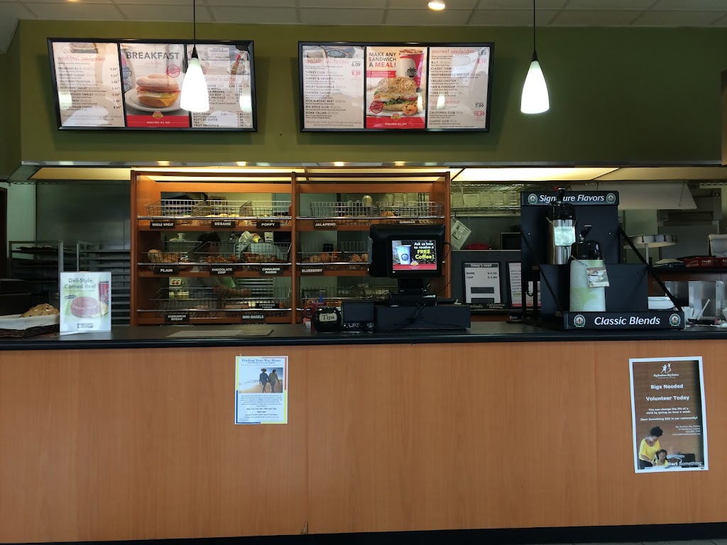 Went on a Saturday morning, not busy. Woman behind the counter was pleasant and patient. I ordered 2 bagel sandwiches to go as per the coupon I redeemed. They were made fast, tasted delicious and this was a positive experience. At other locations I have received a pickle spear with each sandwich, but did not here.