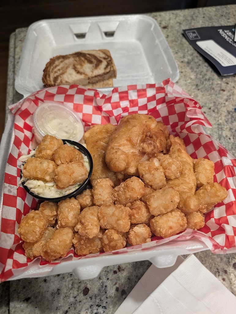 The tater tots were tasty and plentiful. 4 large chunks of cod and there's no room for dessert 🤪. Very economical and friendly folks.