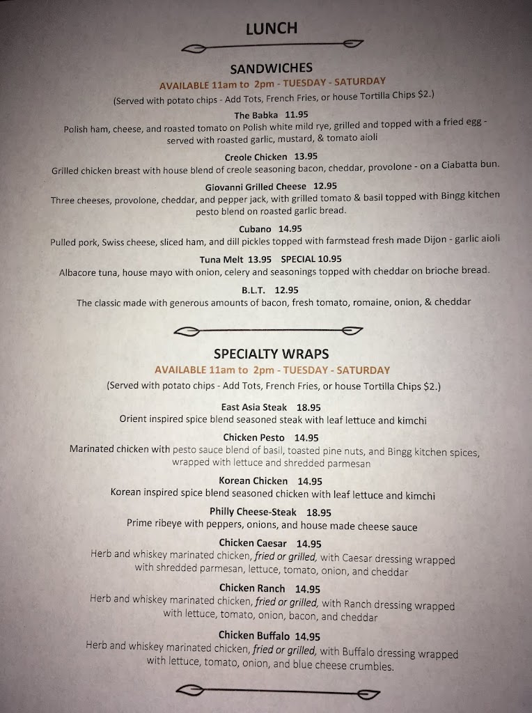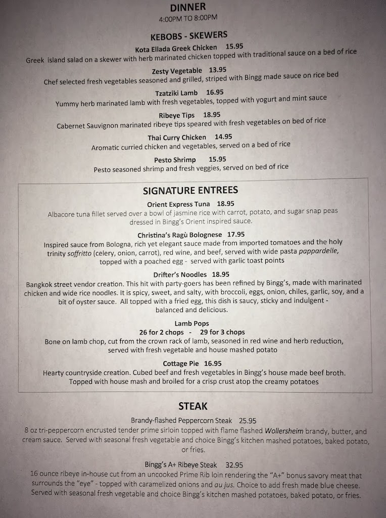 My hubby and I took a drive and happened upon Binggs and we couldn't be happier with our experience. The ambiance, food and owner/bartender/server, Ed were outstanding. After a single bite of our appetizer we were already planning our next visit.