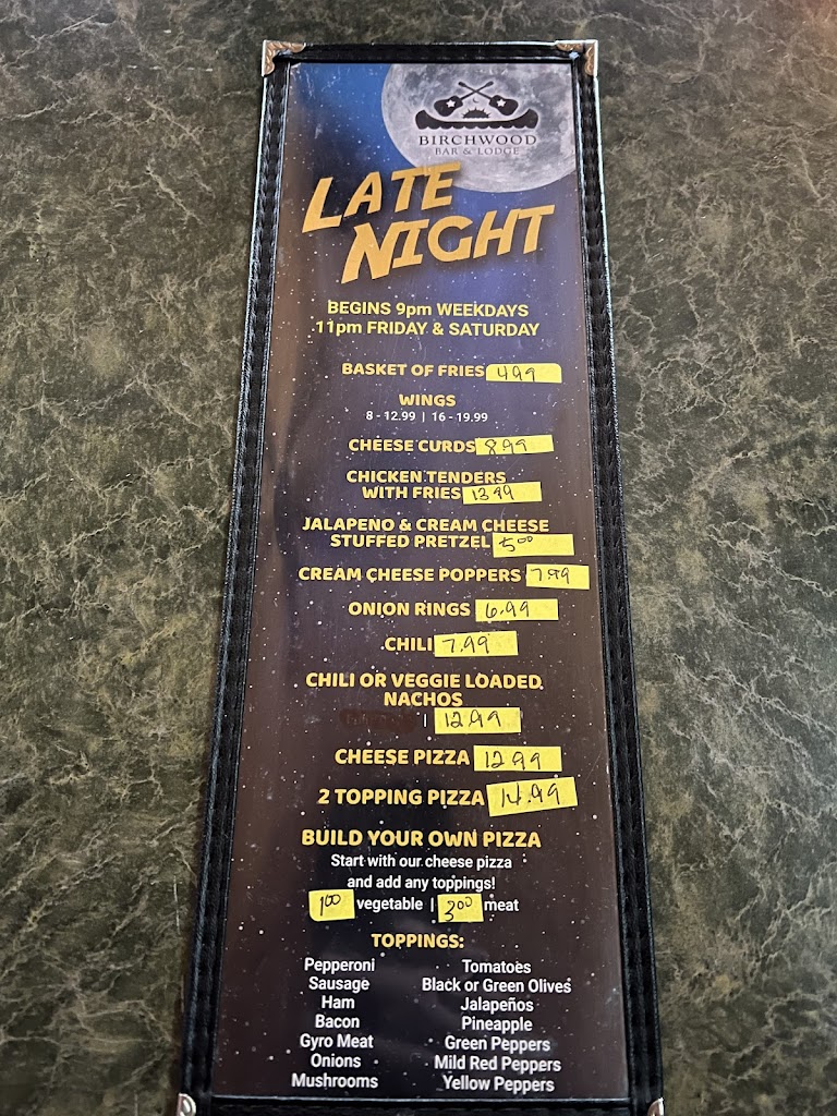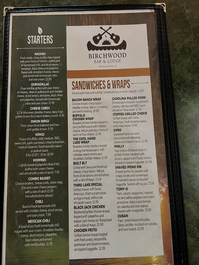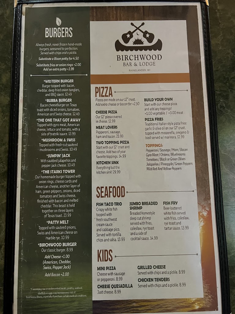 Nice staff good food a+ i though the menu was so different and the burgers sounded great and the pozzas sou ded great and the fish fry sounded great. Everything sounded great lol. The bartender was awesome and she was working alone and kicking butt. And stayed friendly the entire time. I ended up getting the fish and a pizza and boy was I happy with my choice. I will come again to this awesome bat in the backwoods of rhinelander. Trust me this place is good. The fish was decent but the pizza was the real star of the show I ate most of it and only brought some home to have something g to look forward to the next day. I brought my friend out here and she loved it as much as I do. Next time I go I'm getting a burger cuz those looked sooooooo so so so good. Thanks Birchwood for keeping the northwoods at your place. We love you and will continue to come there because you are waaaay way above any competitor in the area.. a freaking plus!!