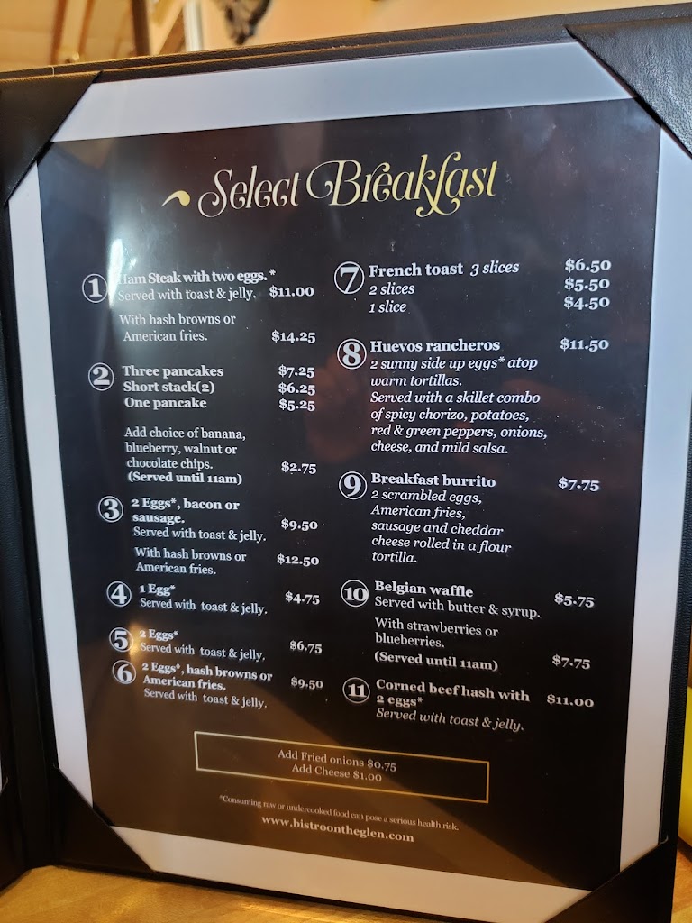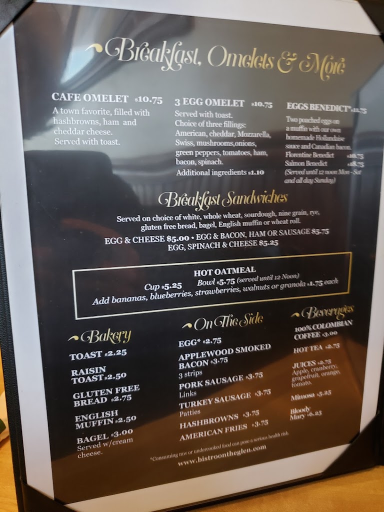 Great food and service! Family friendly and reasonable prices! I highly recommend the Bistro on the Glen for your next destination.
