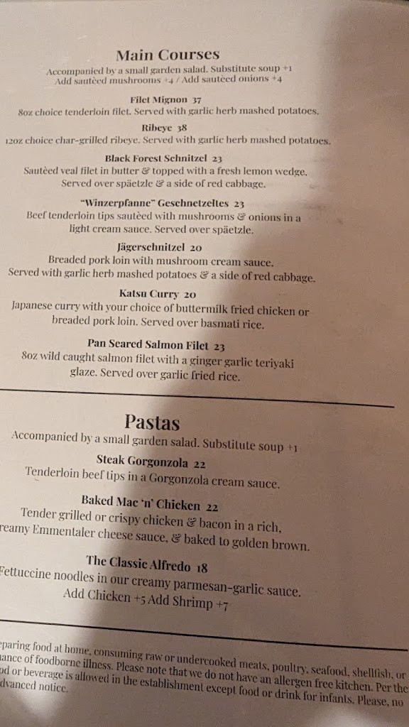 Stopped in with the family on our way to our weekend destination on a Friday night. We tried the birrata bruschetta, salad/soup, Baked Mac N Chicken, Alfredo, Ribeye, & the Winzerpfanne Geschnetzeltes. Everything was fresh and delicious. We left full and happy, and ready to rock the weekend. Highly recommend.