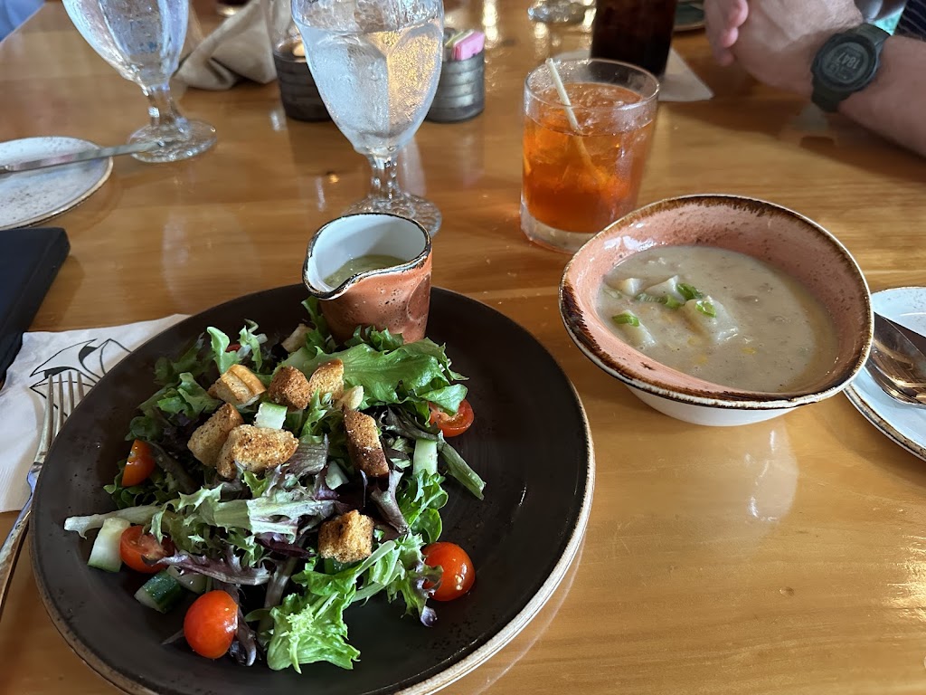 We started with beverages and appetizers in the bar area. Ask for the popcorn! (It's free). Dined in one of the dining areas with a nice view of the 18th hole. Service was impeccable. Corn Chowder soup is a must. This is a higher price point experience, but well worth it for a celebration or a date night.