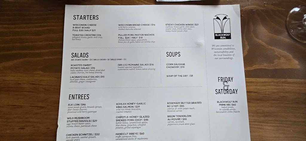 We attended Blackwolf Run for Mother's Day. Our server was very matter of fact and not friendly. The food was good bar food. The salmon was very good. We will return because of the ambiance and location. Also, everyone else at the golf pro shop and other wait staff was very cordial!
