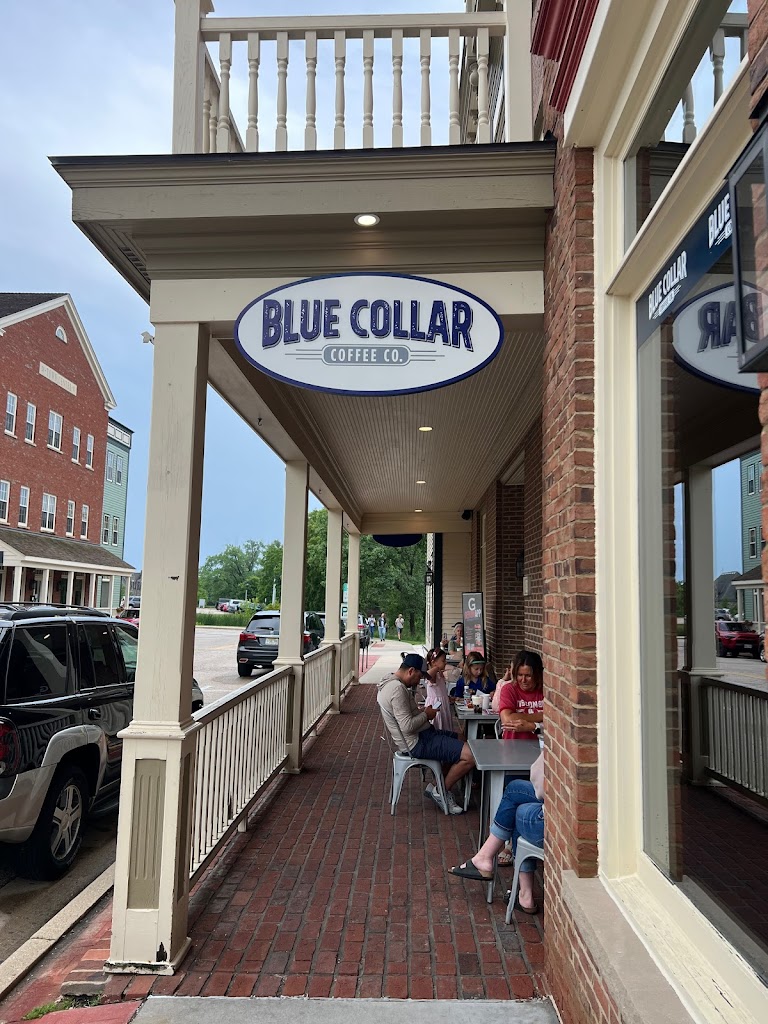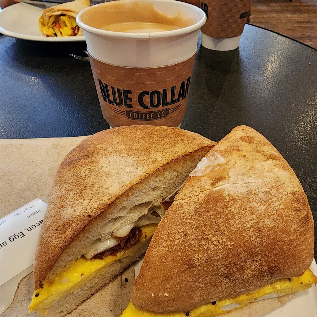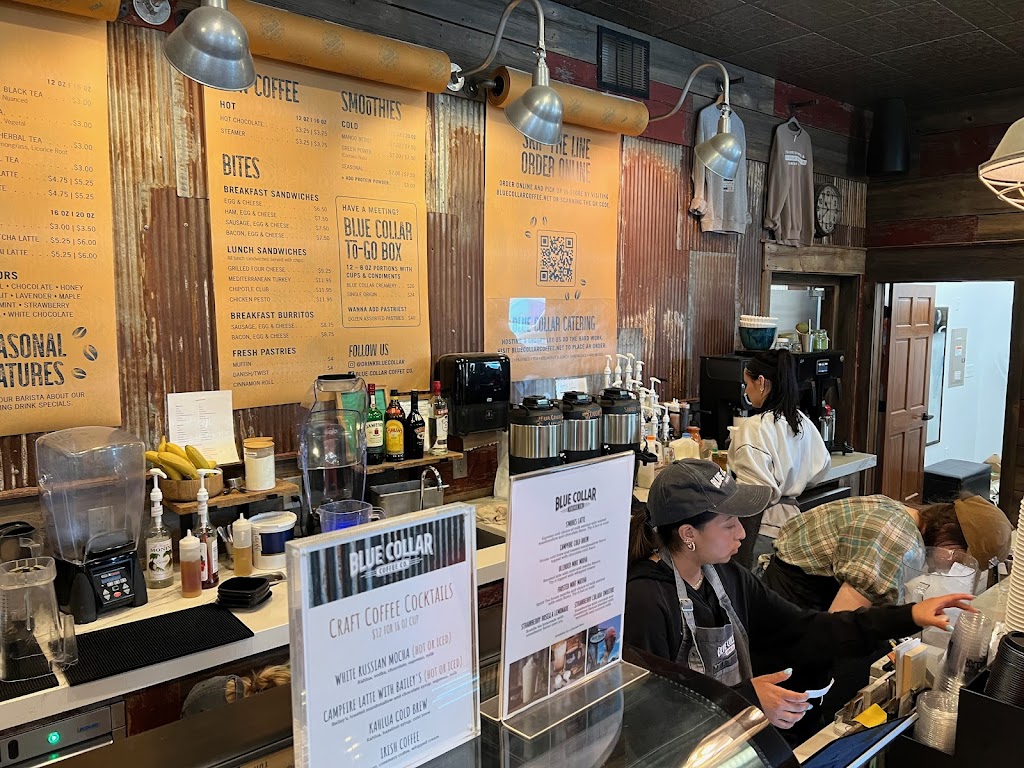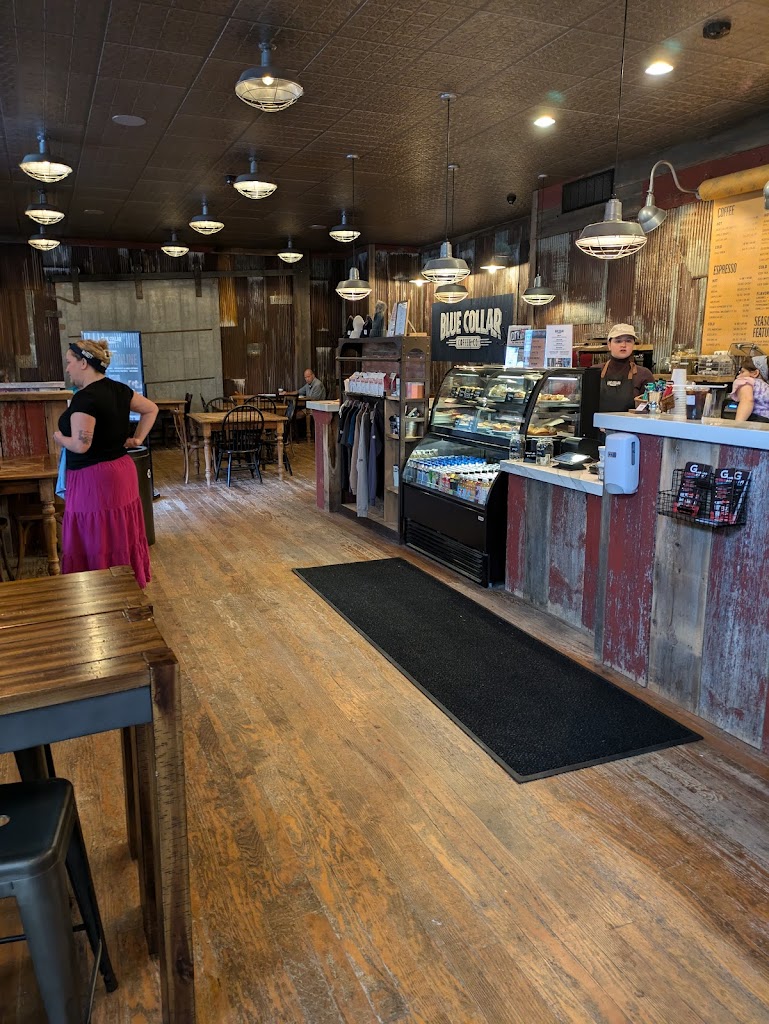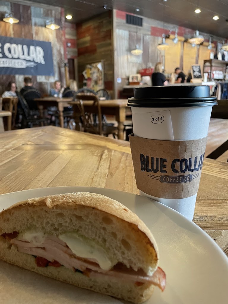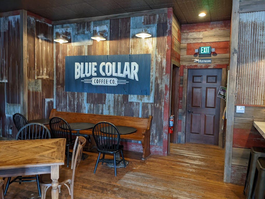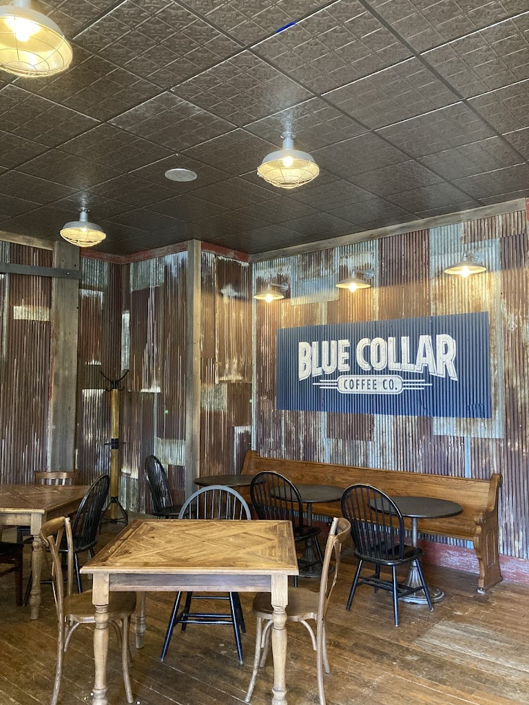 The aesthetic at blue collar coffee is 10/10! If you're like me and care about the vibe (and cleanliness) of a coffee shop, you'll like Blue Collar! It has a charming atmosphere, plenty of seating, a simple menu, clean restrooms, and great free wifi.