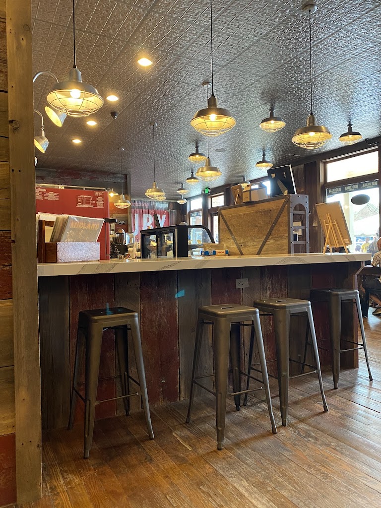 The ambience is somewhat dystopian with rusted sheet metal and roughly finished hardwood floors. There’s plenty of space so congregate or to get some work done.