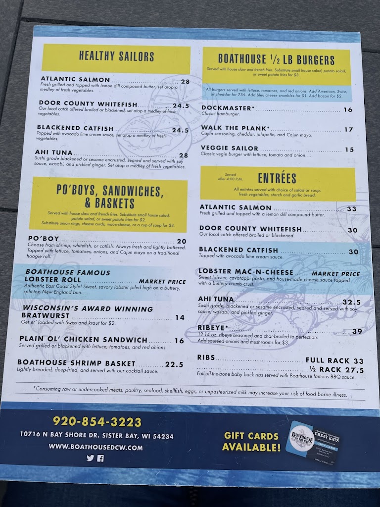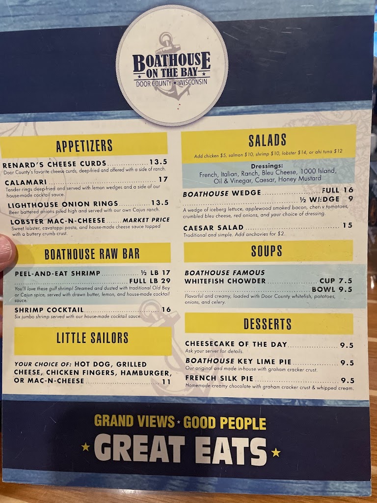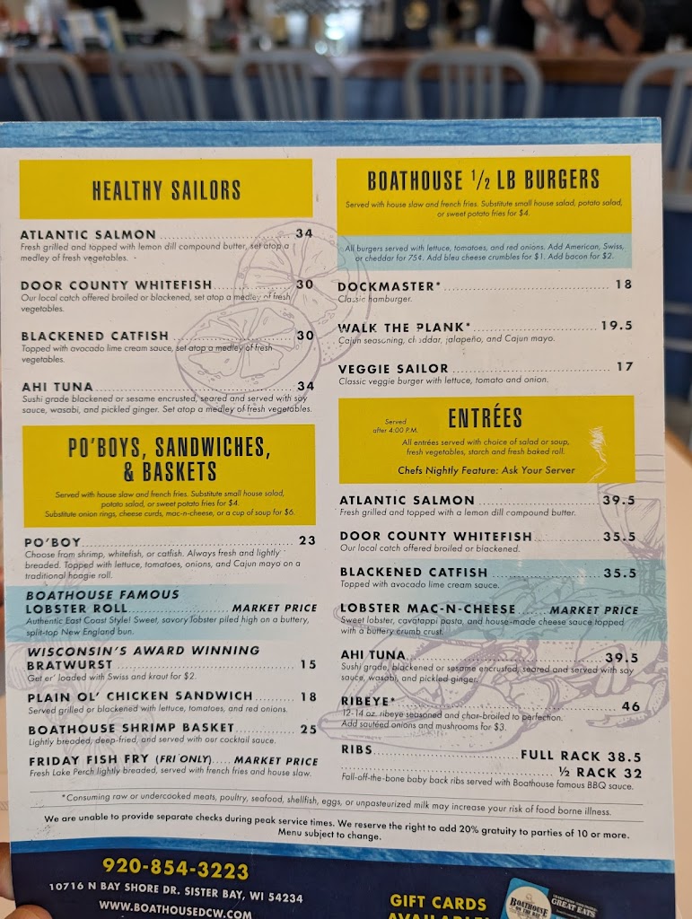 The menu is on the pricey side, but that seems to be more about Sister Bay in general than this restaurant specifically. Overall, a great spot for lunch with attentive service and good food.