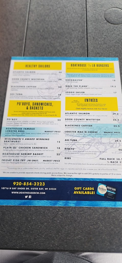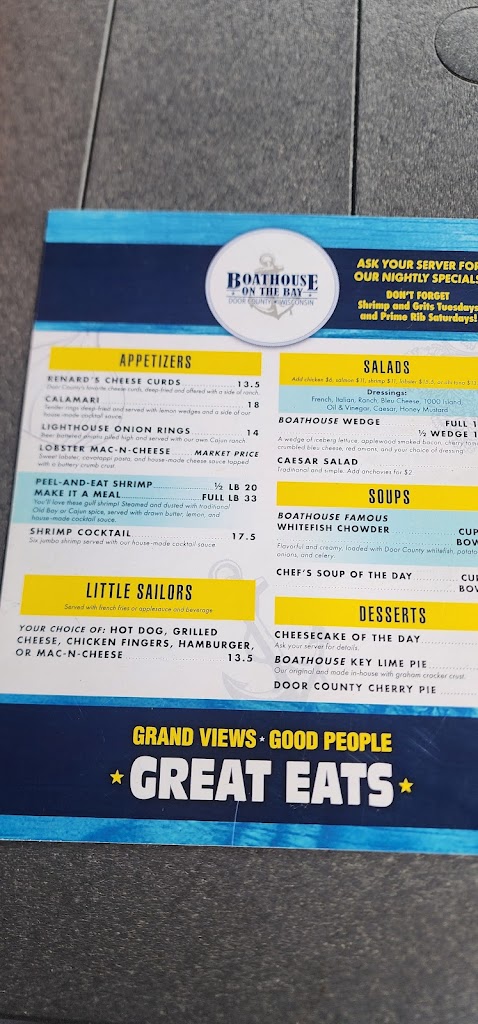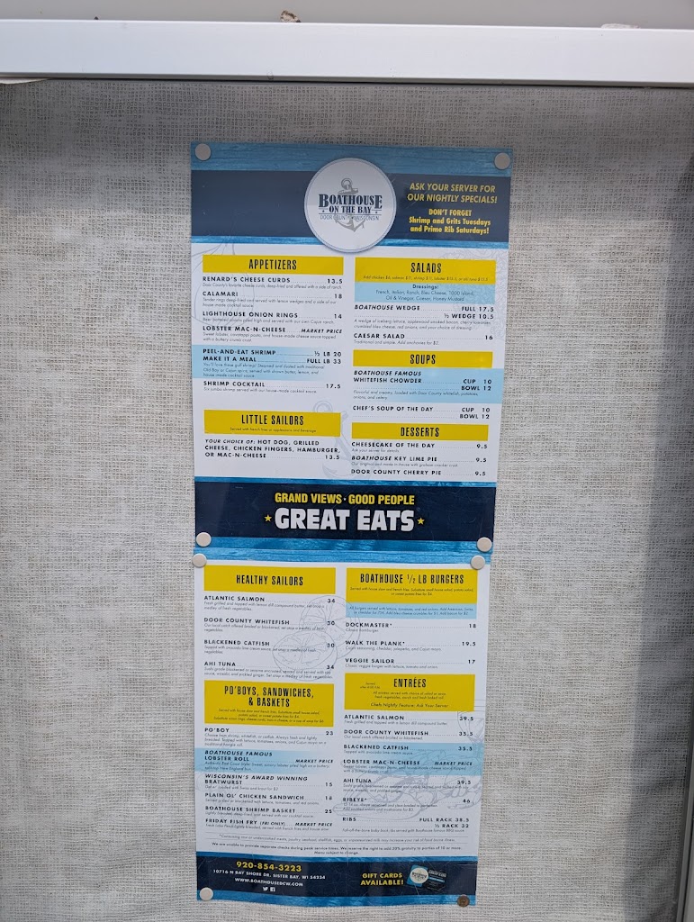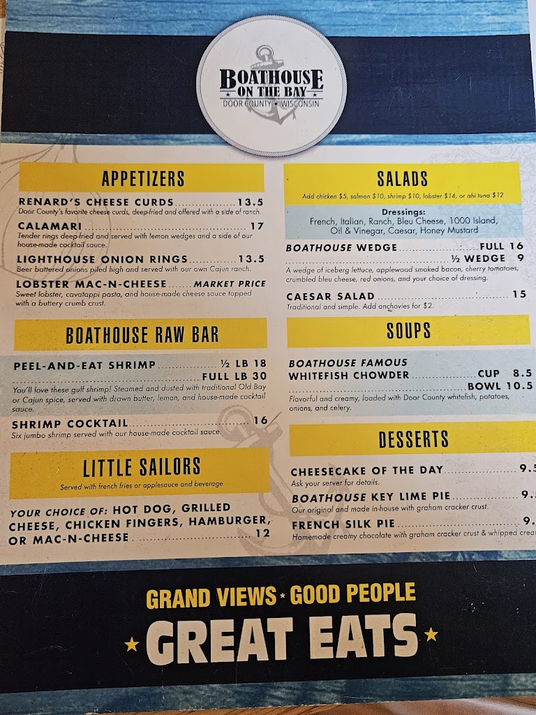 Original review: We couldn’t have been any happier. The service was great, the view is excellent, and the food was incredible. Splurge on the lobster roll - so worth it! The white fish poboy was the freshest fish I have had in a long time. The fries are great and the beer is cold. What more can you ask? 10-5-23 update. Ate at the bar. The service was awful. The food is still great.10-4-25 update: Service was great. Food was great. Still expensive but it is Door County.