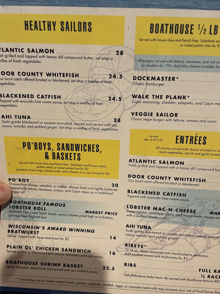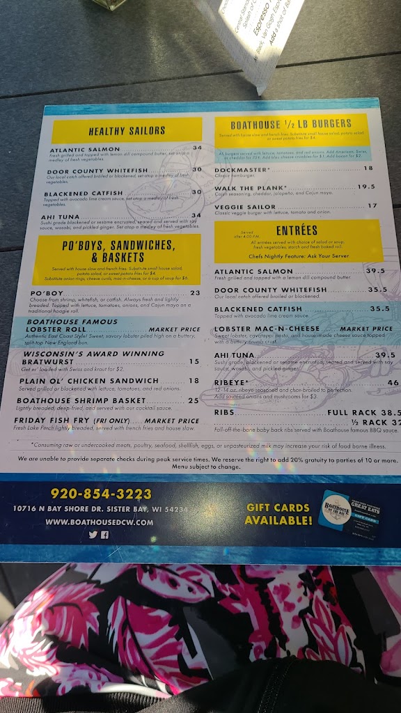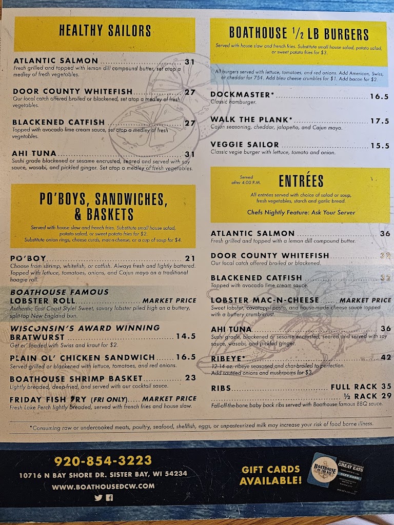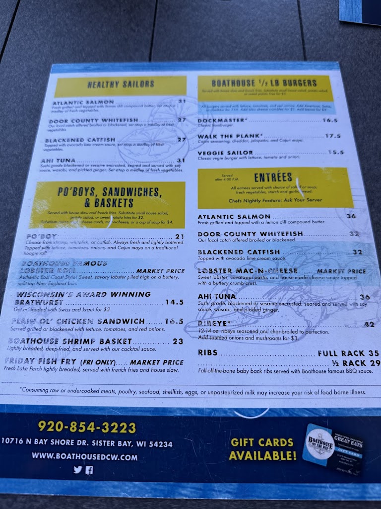 Whenever we visit Sister Bay, we always make sure that we stop at the Boathouse for a lobster roll. They have never let us down - always great food and excellent service. It's pricey for lunch, but worth treating ourselves once in a while.