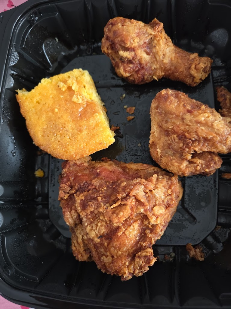 The chicken itself was disappointing. Three dinners had four pieces. One dinner had three. Cornbread was OK. Overall, we were underwhelmed.
