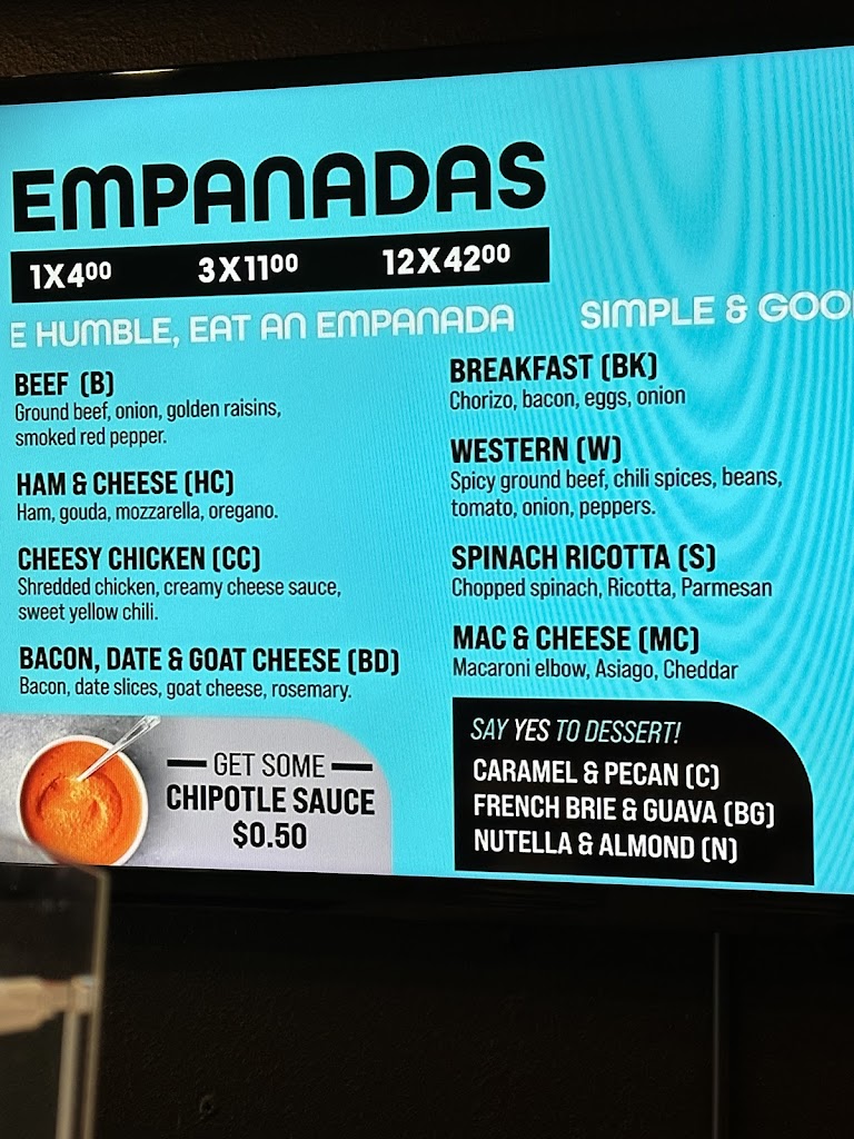 We really enjoyed the empanadas here! We tried the breakfast, cheesy chicken, beef, ham and cheese, and the western empanadas and all were delicious. The service and food was great. There isn’t anywhere to dine so I would recommend taking your empanadas to go or for delivery. We will definitely be returning soon!