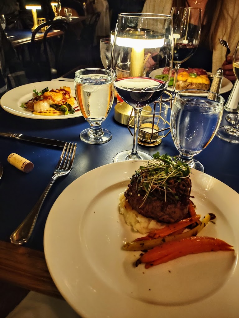 location and building is beautiful however we couldn't dine outside on such a beautiful evening due to not enough servers, which was disappointing. service was not great, water glass empty the whole meal, prices are steep but quality was not worth it.. rare steaks were tough and overcooked and way too salty ( needed water refills) 1st time and will be last time. we live on a lake so we dine out for the food and service. sad to say not impress with either.