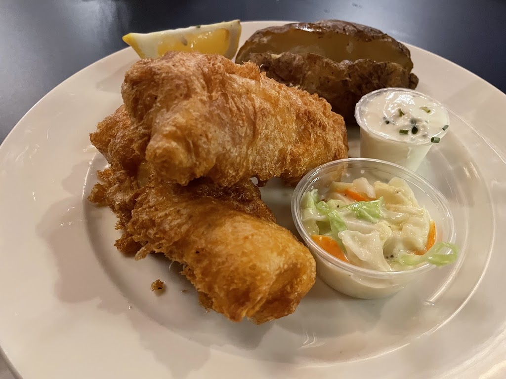 $36 for a one piece fish fry incl tip. Fish, tiny amount of coleslaw and fries. Water to drink.