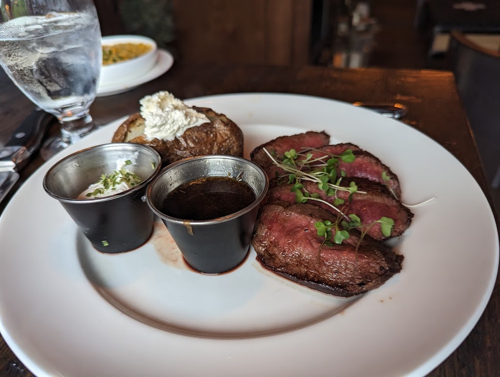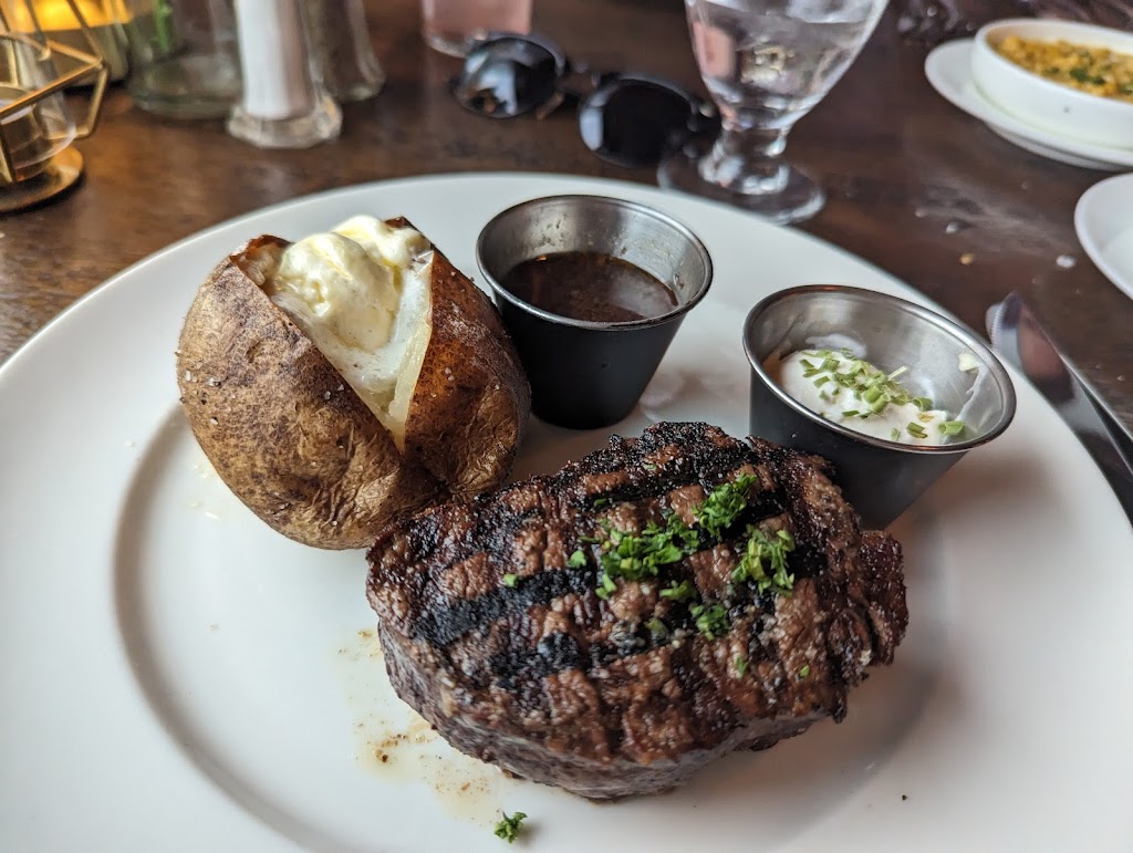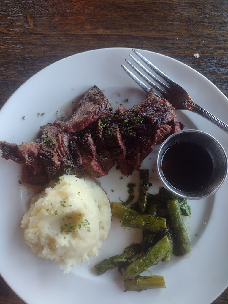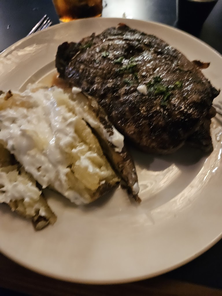 The ribeye was seasoned properly and cooked to a proper medium rare. Mashed potatoes were tasty.