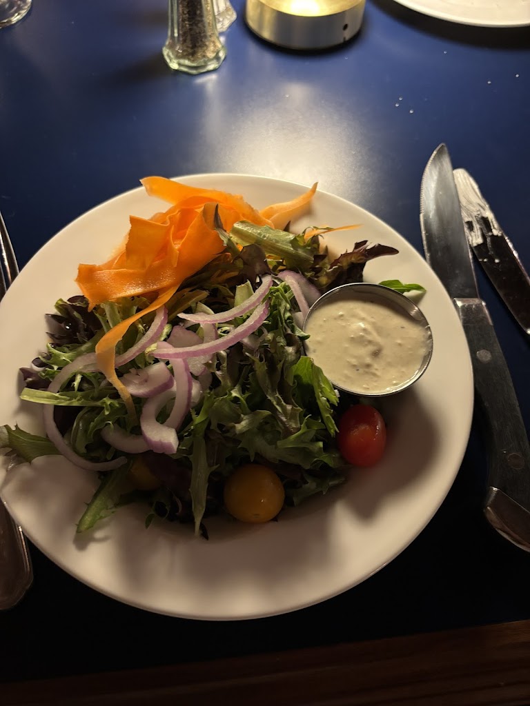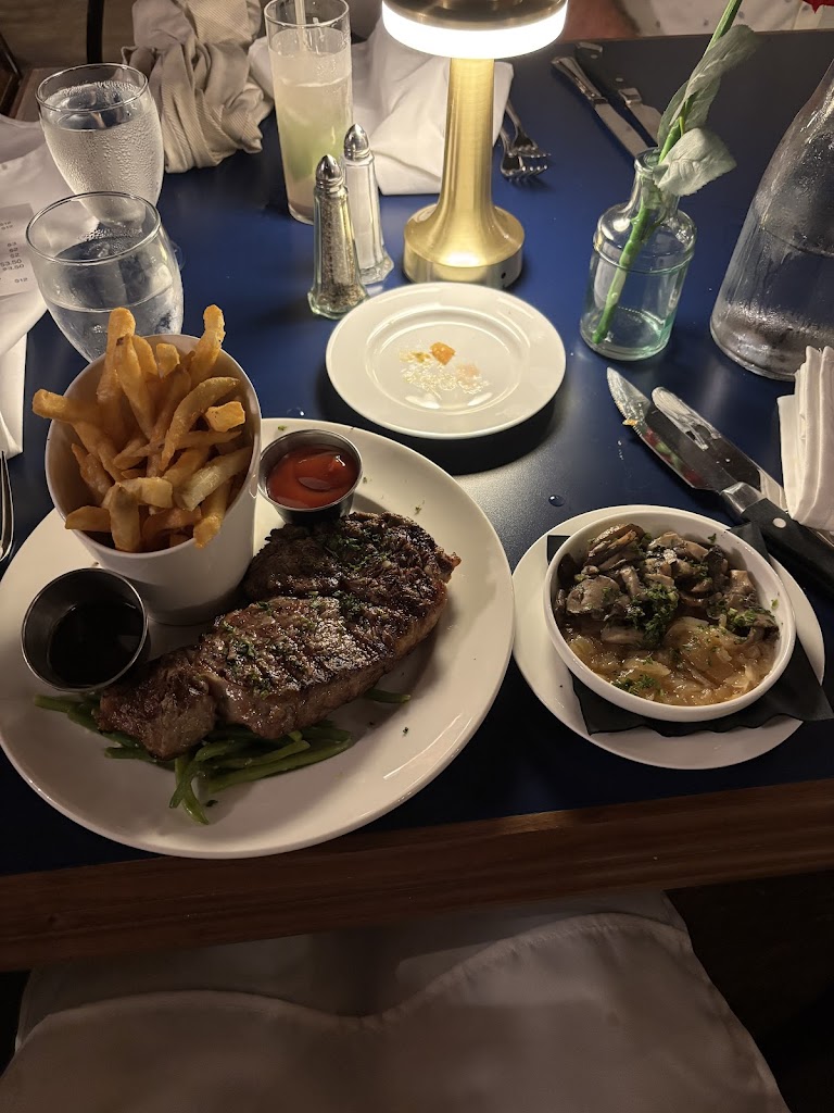 This place looks fancier than the food is. I started with the house salad that came with the steak and it was probably the best part of the whole meal. My entree was a disappointment to say the least. The fries were a mix of cold and warm ones. They obviously weren’t made fresh. But my biggest issue was the steak. I ordered a medium-rare and the middle of the steak was cooked well and tasted good, but the outsides of my steak were rare if not even more raw than that. It was gross that I couldn’t even eat 1/4 of my steak since it wasn’t cooked. I just don’t understand how it was cooked to where the inside is done but not the outside. Overall I wouldn’t come here if you’re looking for a good meal and it’s definitely quite pricey for what it is.