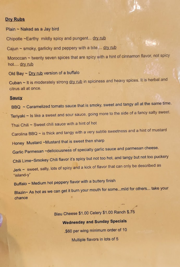 Picked up wings on Wednesday, was told that carry out is regular price, not the Wednesday Special Price of $0.75 per wing. So I place the order for 3 different flavors of wings at $15.00 per order, BBQ, Buffalo and Teriyaki, I was asked if we wanted dipping sauce and that it would be extra (of course)
