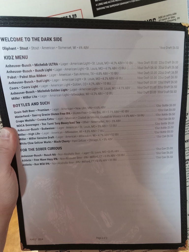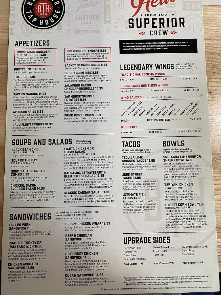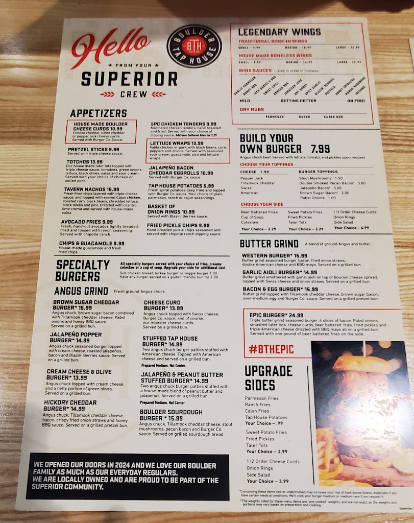 Our server was very attentive and friendly. We loved the atmosphere. Seems like our group was happy with the appetizers they ordered. Great addition to Superior.