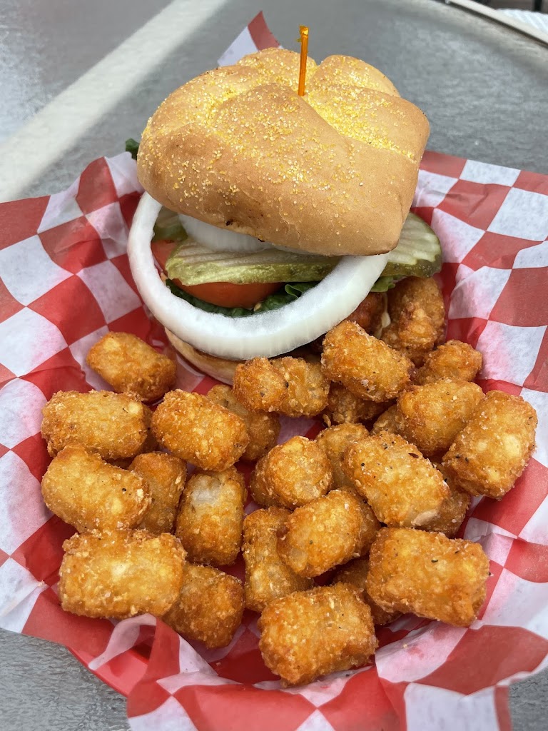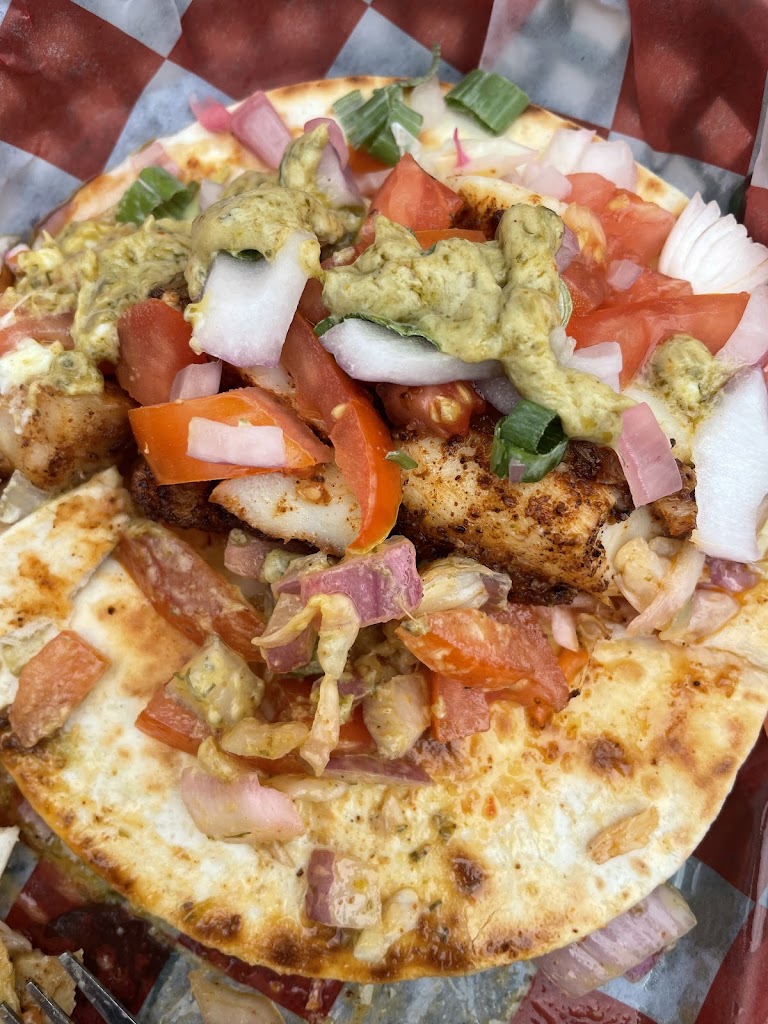 Outstanding Hawaiian Fish Tacos and Delicious Hot Honey Chicken Sandwich! We ate outside with our puppy, and it was so relaxing.