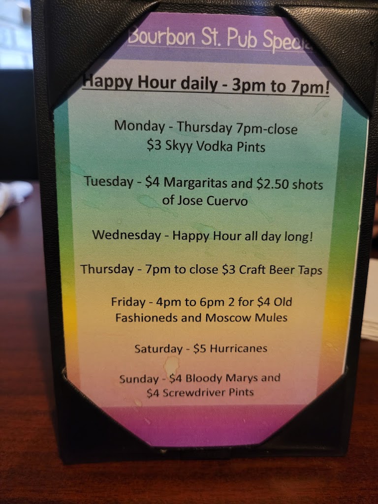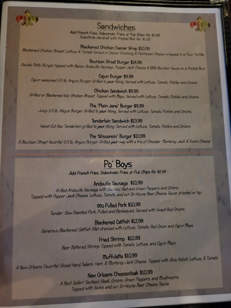 We love Bourbon Street and will frequent on Friday nights. Service is quick, you can eat at the bar or wait for a table. My favorite has always been the gumbo, it's authentic and has just the right amount of spice for a kick. The Po'Boy catfish sandwich, Bayou Crawfish, Étouffée and Gumbo-Laya are also family favorites. Don't forget about drinking a Hurricane, it won't disappoint!