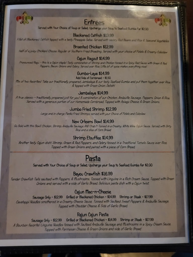 Delicious creole/cajun food! After living in the area for years, my husband I finally tried Bourbon St. The hurricane drink ran a little too sweet for my taste, but the food was spot on. I preferred my husband’s jambalaya. The gumbo and clam chowder were delicious. Our server was incredibly kind. Great atmosphere.