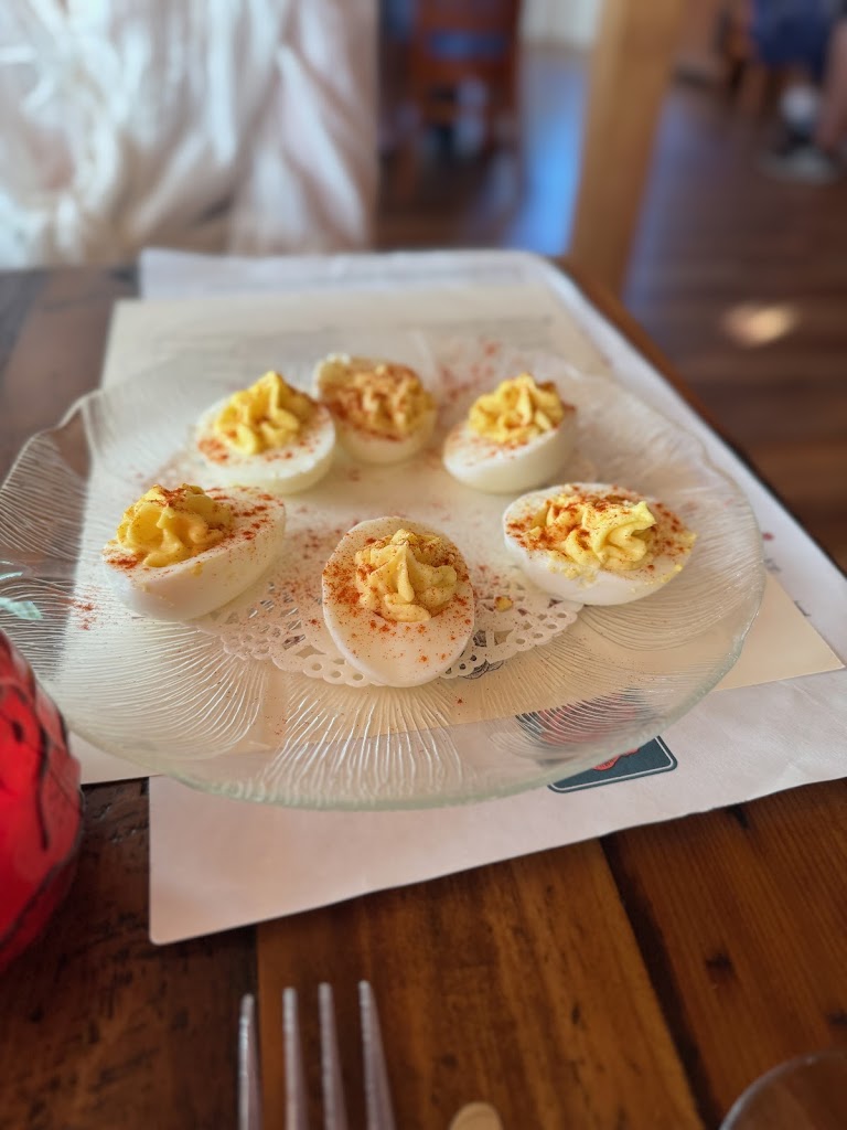The deviled eggs were great. Also loved the soup and espresso filet. We sat in the back room and had a great time. We have also been back to sit in the front and loved that space as well.