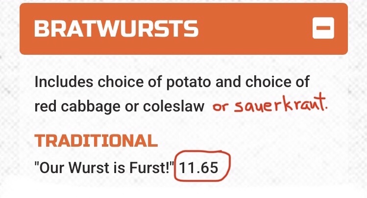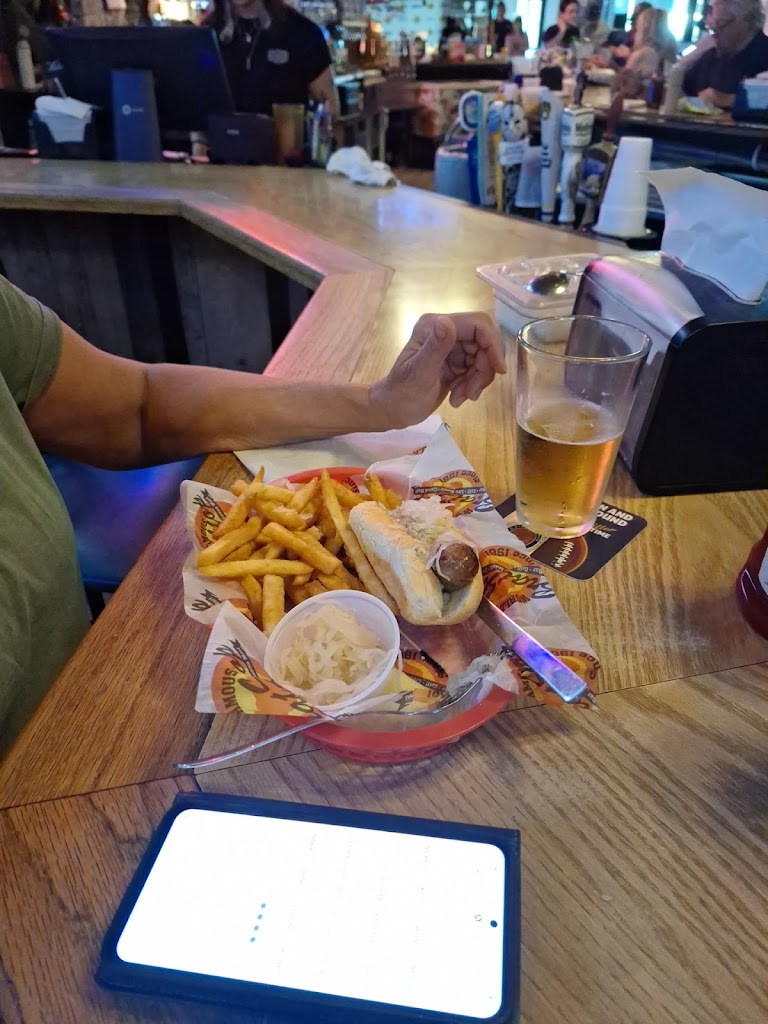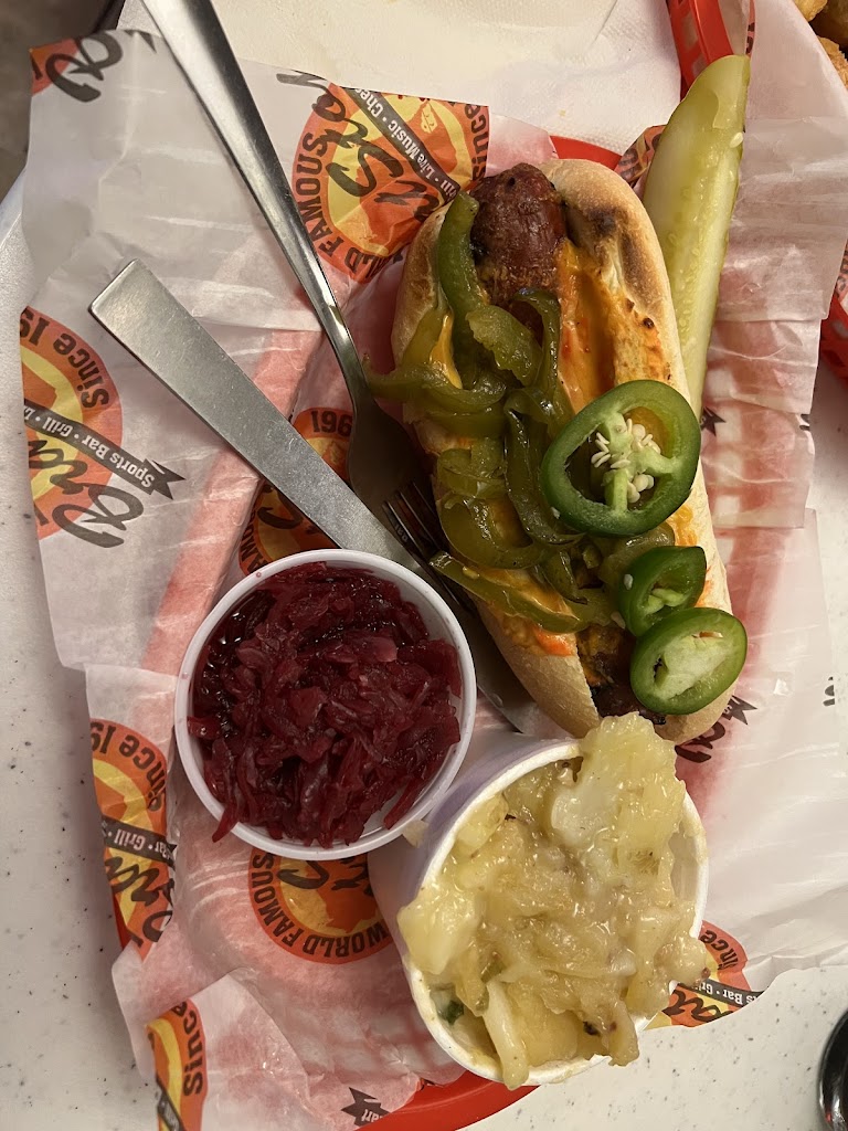 It's a sports bar with bratwurst options and usual sports bar food. Reasonable pitchers of soda.