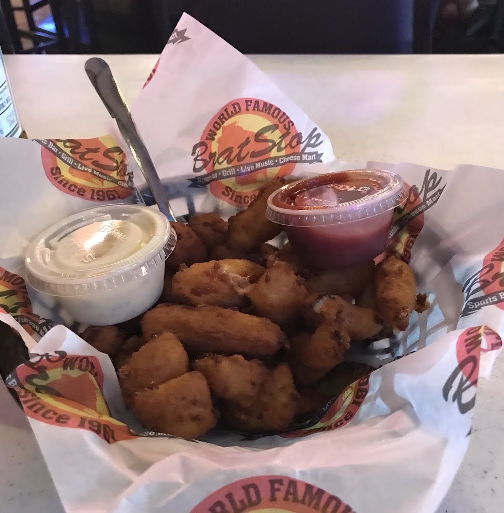 Had to have brat and fried cheese curds while visiting Wisconsin. Great brat with sauerkraut!