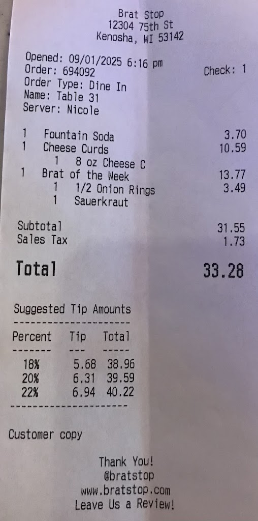 Brat Stop is our absolute favorite spot. honestly, the best hot dog place of my life! Even though we live in the Chicago suburbs, we don’t mind driving all the way to Wisconsin just for their amazing hot dogs. The cheese curds, onion rings, and hot dogs are all fantastic, and the spacious, family friendly atmosphere makes every visit so easy and enjoyable. Every time we come, the staff are always so kind and provide perfect service, especially Kiana, thank you so much for making our visits even better!