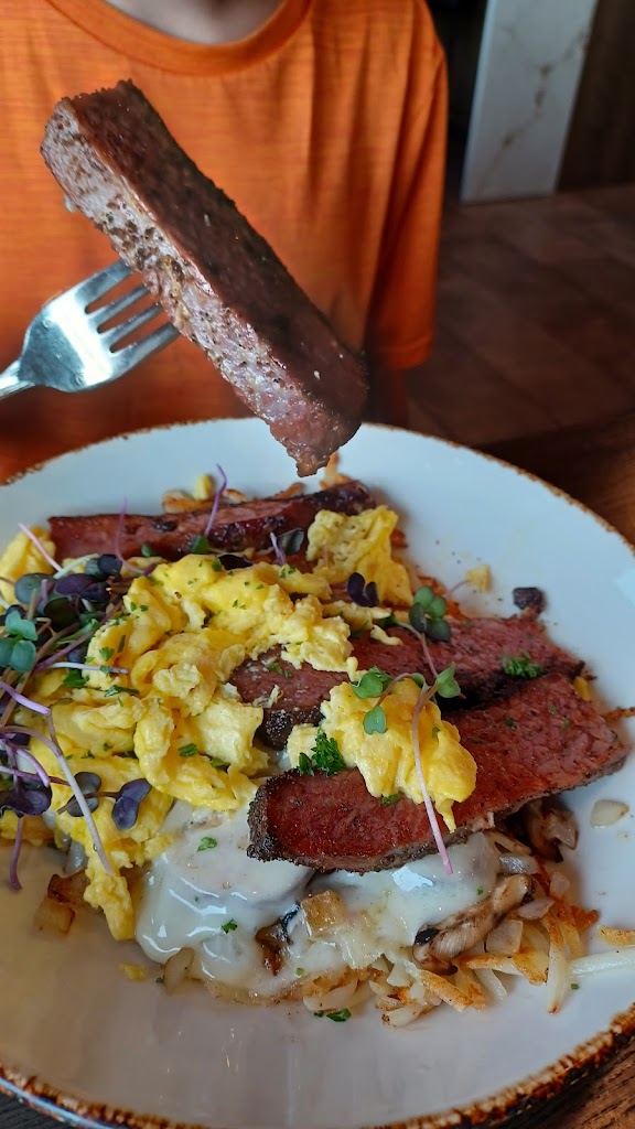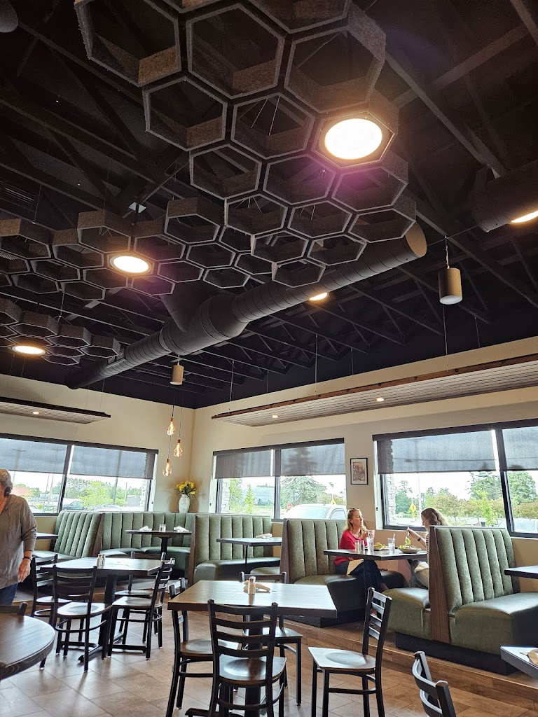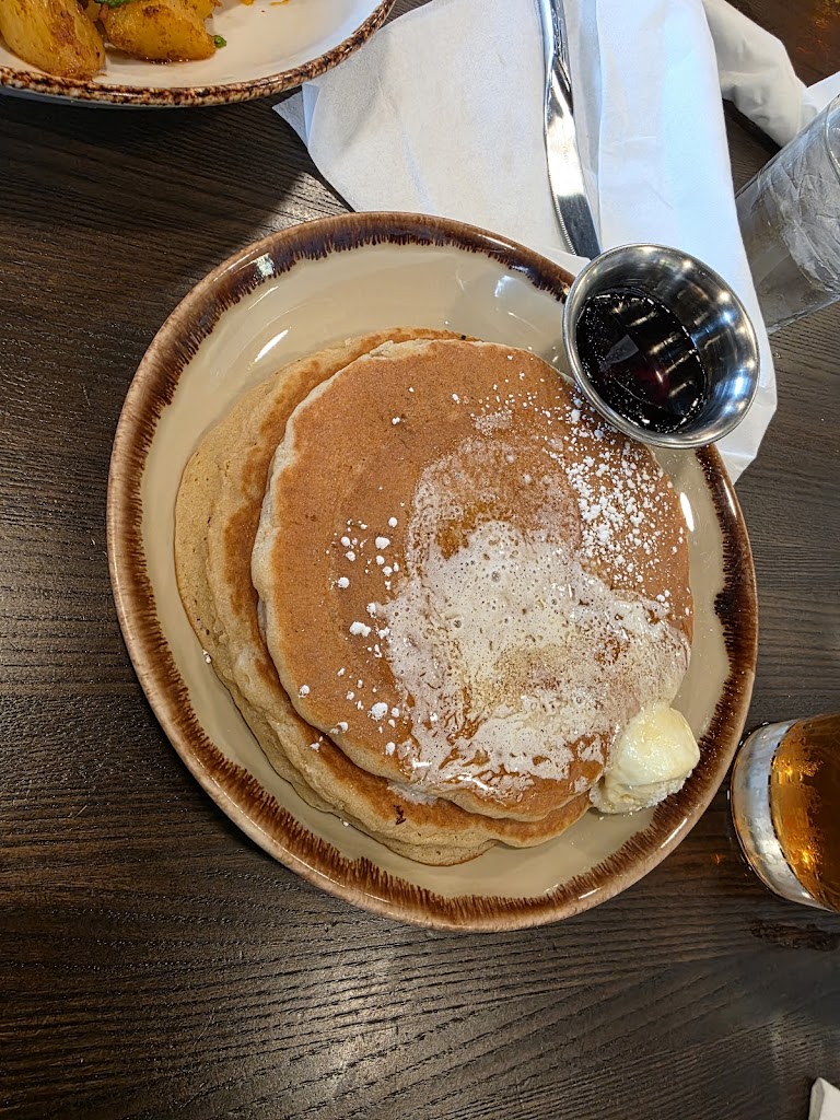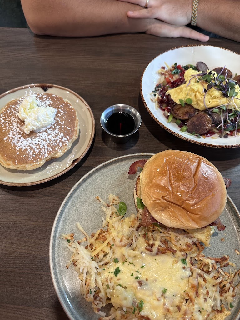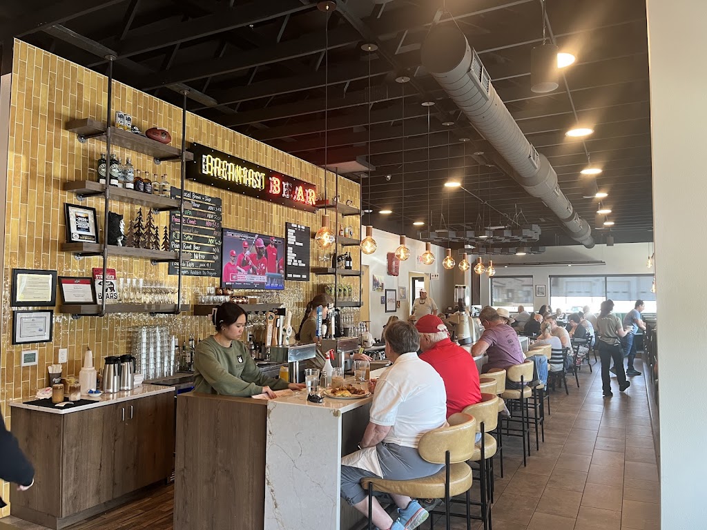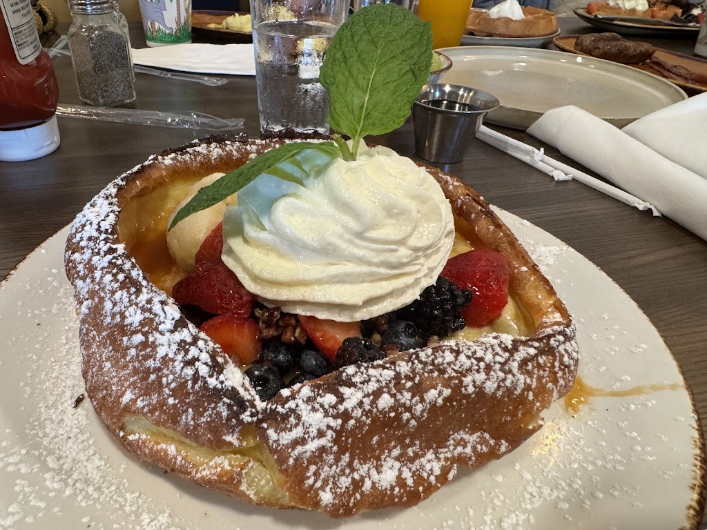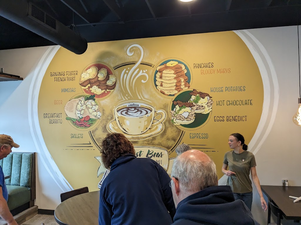 We had breakfast with family here recently. It has a nice spacious open feel, soft booths so the kids can easily eat without hurting themselves. The decor is nice and modern with soft little quirky touches (ie Bear in chair suspended from ceiling). Staff did a great job. The food was overall pretty great. I wasn’t a fan of the amount of caramel on my Dutch baby (my husband also said the sauce in his Bananas Foster French Toast was a little too much) and that the whipped topping was Cool Whip vs real cream, but now I know. Outside of that-the coffee, eggs, breakfast meats, and pancakes, French toast, etc. were all good. The fresh fruit was a very nice touch-it wasn’t just unripe melon like many restaurants have, it was a mix of berries, bananas and green grapes. I would definitely go again, but might ask for very light sauce (or on the side) if I order pancakes, French toast, etc.
