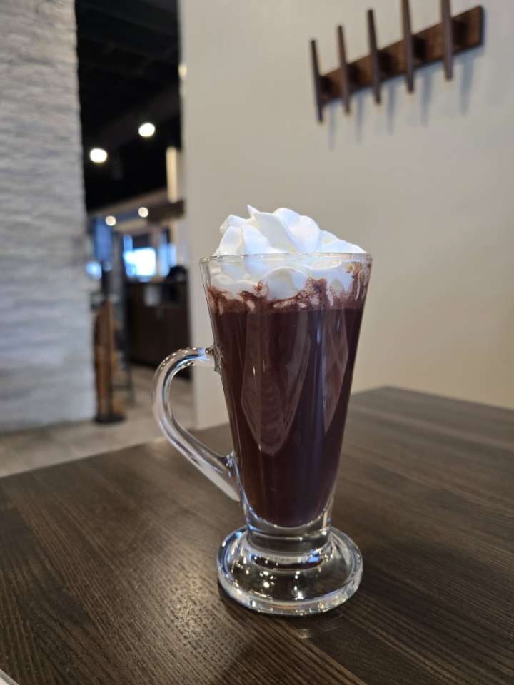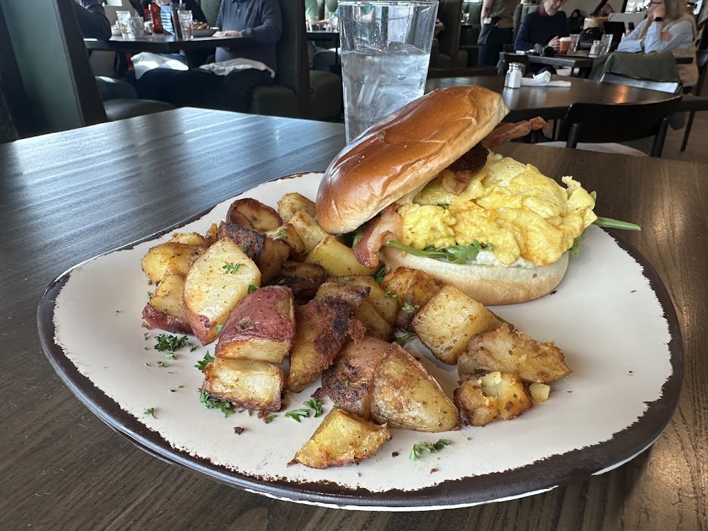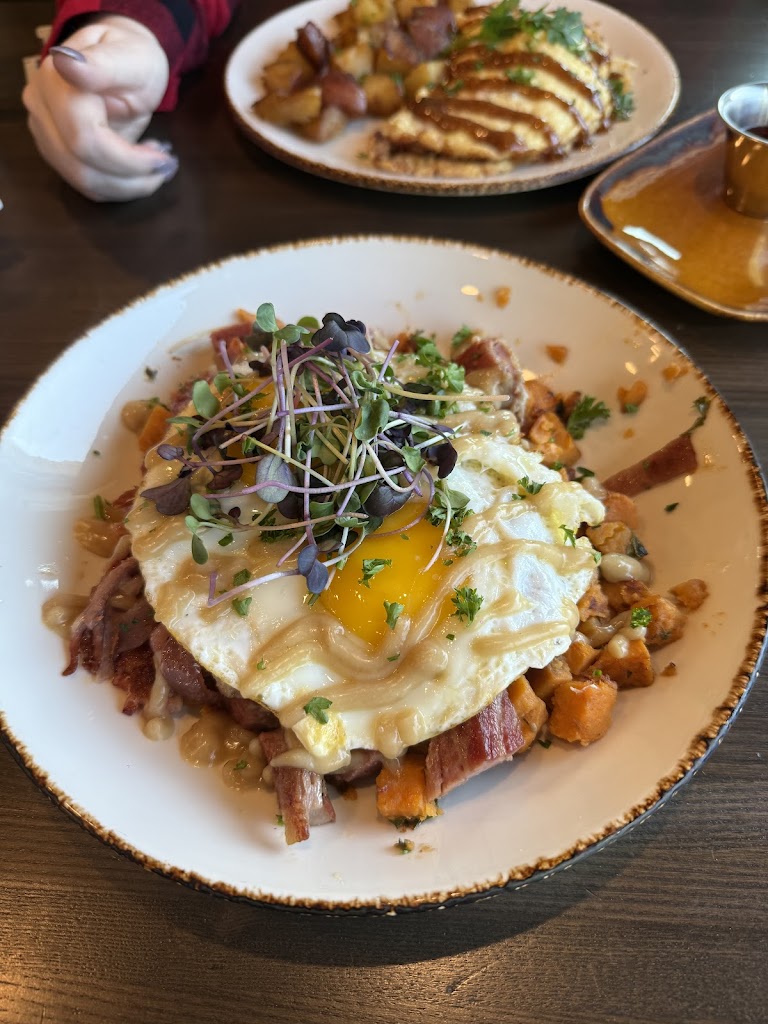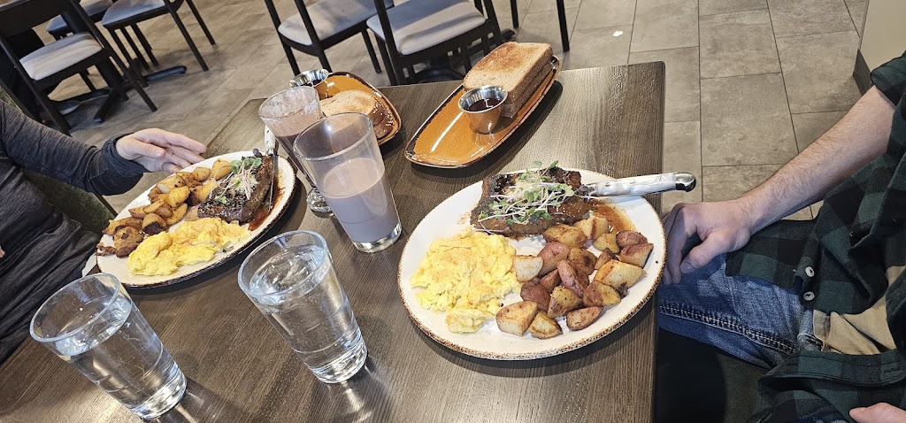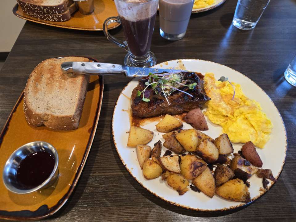 The first thought I had was "Starbucks of Restaurants." The atmosphere is a mix between lumberjack and modern. Two of the people with me ordered hot chocolate, and we are pretty sure they were made with the expresso chocolate. The staff were friendly and attentive. The steak, which I only had a bite of, was amazing. We think that they might marinade them. The bacon is great with just enough pepper and sugar to balance each out. The potatoes, though, nobody enjoyed. They almost seemed undercooked.