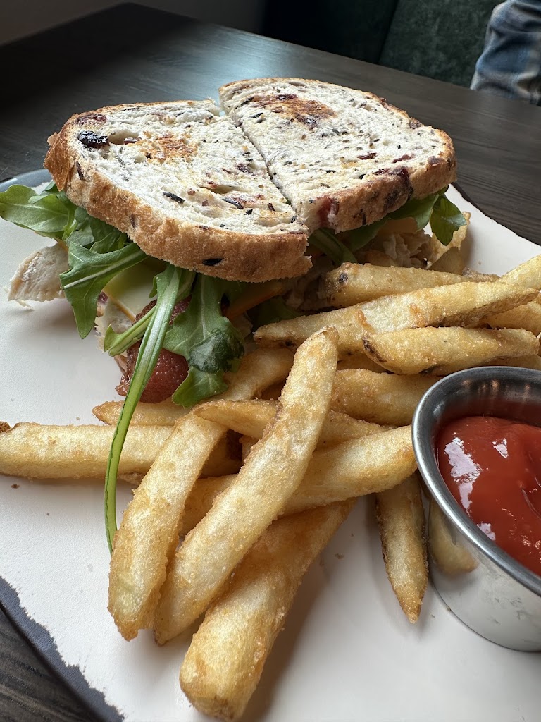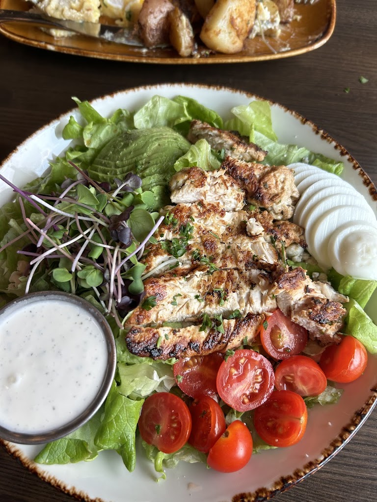 wait. The restaurant itself is super charming and cute! We were greeted timely but then sat at a very obviously still dirty table. We asked to have it cleaned and it was hastily wiped which at least took care of the syrup. We split the salmon eggs benedict to start. Rather disappointing. There was really no good flavor and everything was mushy. My husband had the burger and fries and those were fantastic. The waitress recommended the cobb salad to me. The salad was nice to look at but again was rather bland. Overall, just ok. We will have to come back and try some other menu options.
