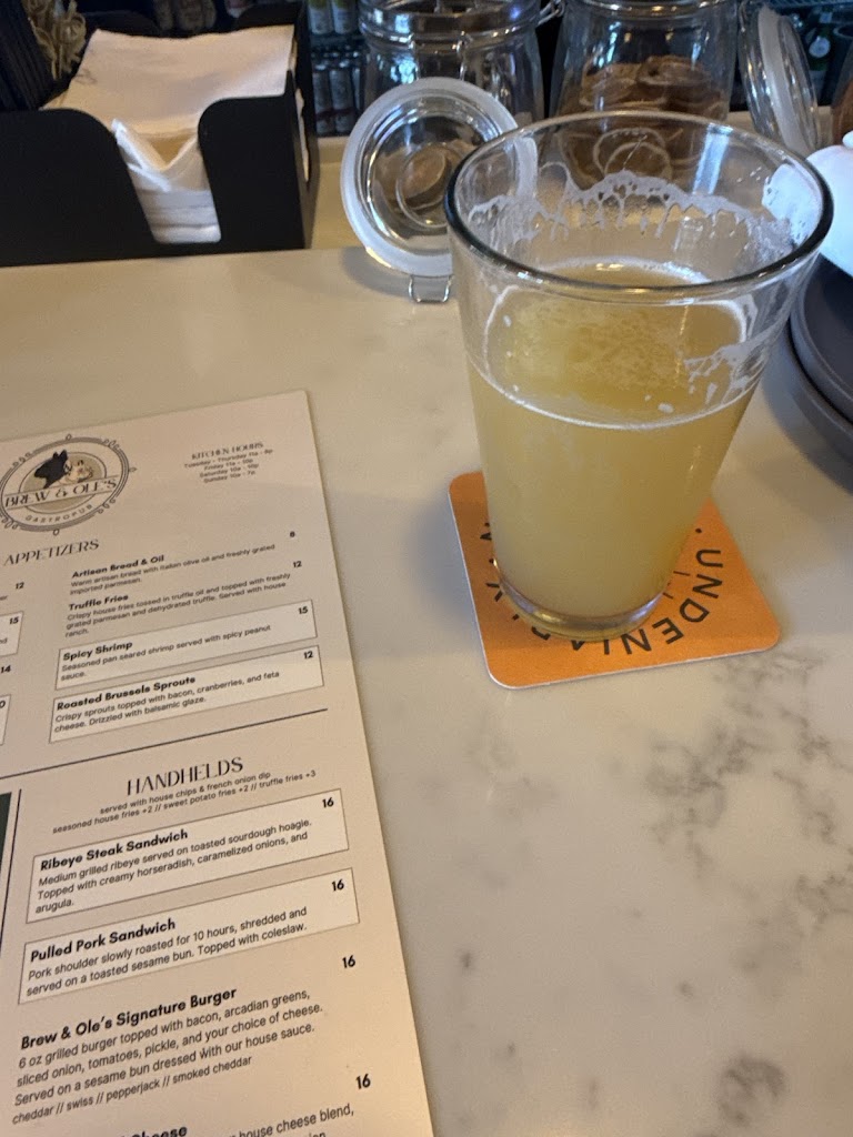 Love brew and Ole’s! Beautiful place to dine and drink. Friendly staff and great food. Tonight we ordered the Ribeye…. Do not pass this dish up, it was absolutely delicious. Hands down beats some of the best steakhouses. Perfectly cooked and absolutely amazing potatoes and beans.