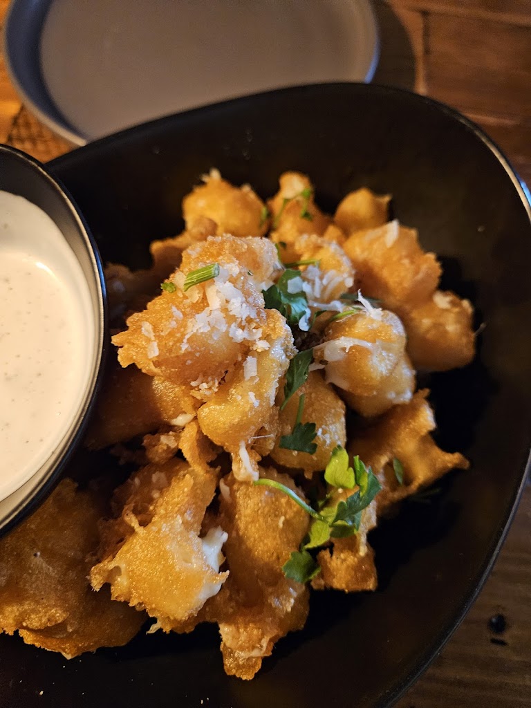 Emily the host was all smiles and welcomed us enthusiastically. The cocktails were masterful and again served with a welcoming smile and a genuine thank you. I loved the deep bar with plenty of room to eat at the bar if you prefer. As a shareable I didn’t want to share-it was that good. The pieces of crunchy crusted Italian bread were the perfect size. They were easy to handle because each piece was made individually. Not the usual where you see an entire large piece cut up and all the topping fall off when you pick them up. It was served with a side of the reduction balsamic-love that!! Control your own balsamic adventure! I had the ravioli-the only way to improve would be for it to be just slightly warmer it was fabulous-I will definitely be ordering again. My friend had the ribeye steak sandwich cooked to perfection with that delicious backyard grilled char-spectacular! The sandwich was served with crispy homemade chips and a side of French onion dip-a unique twist you don’t often see. My husband had the fish tacos that had generous portions of fish. His only want would be more of the sauce. My other friend had the wings. Also made to perfection-crispy crunchy on the outside moist and meaty inside. The coating was delicious and the perfect amount. We all will definitely be making this restaurant one in the rotation of regular favorites.